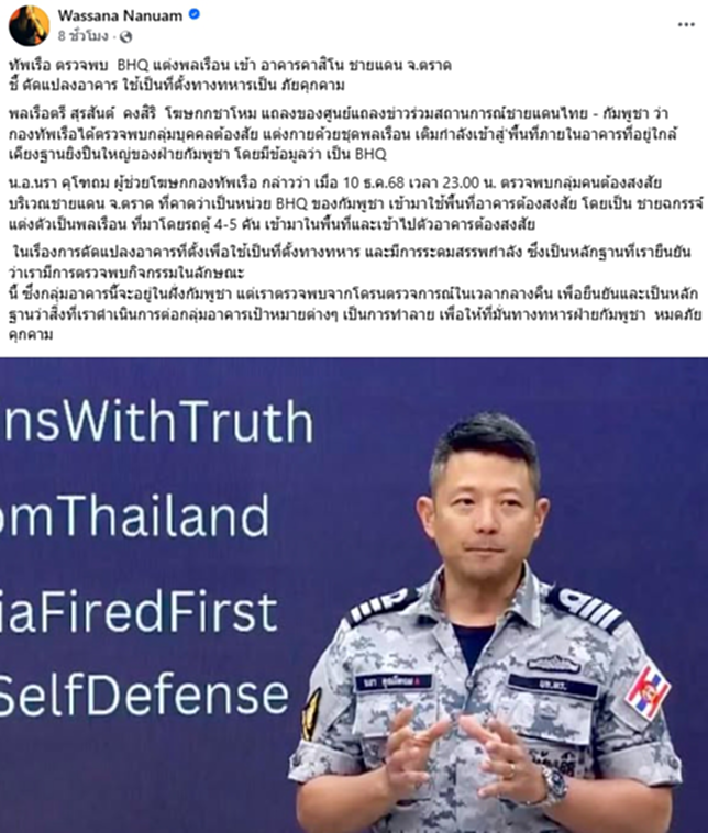 นาวาเอก นรา ยังกล่าวถึงกรณีเมื่อวันที่ 10 ธ.ค.68 เวลา 23.00 น. ได้ตรวจพบกลุ่มคนต้องสงสัยบริเวณชายแดน จ.ตราด ที่คาดว่าเป็นหน่วย BHQ ของกัมพูชา เข้ามาใช้พื้นที่อาคารต้องสงสัยว่า ตามข้อมูลที่รายงาน พบชายฉกรรจ์แต่งตัวเป็นพลเรือน มาโดยรถตู้ 4-5 คัน เข้ามาในพื้นที่และเข้าไปในตัวอาคารต้องสงสัย ตามที่เคยชี้แจงไปเมื่อ 2-3 วันก่อน ในเรื่องการดัดแปลงอาคารที่ตั้ง เพื่อใช้เป็นที่ตั้งทางทหาร และมีการระดมสรรพกำลัง