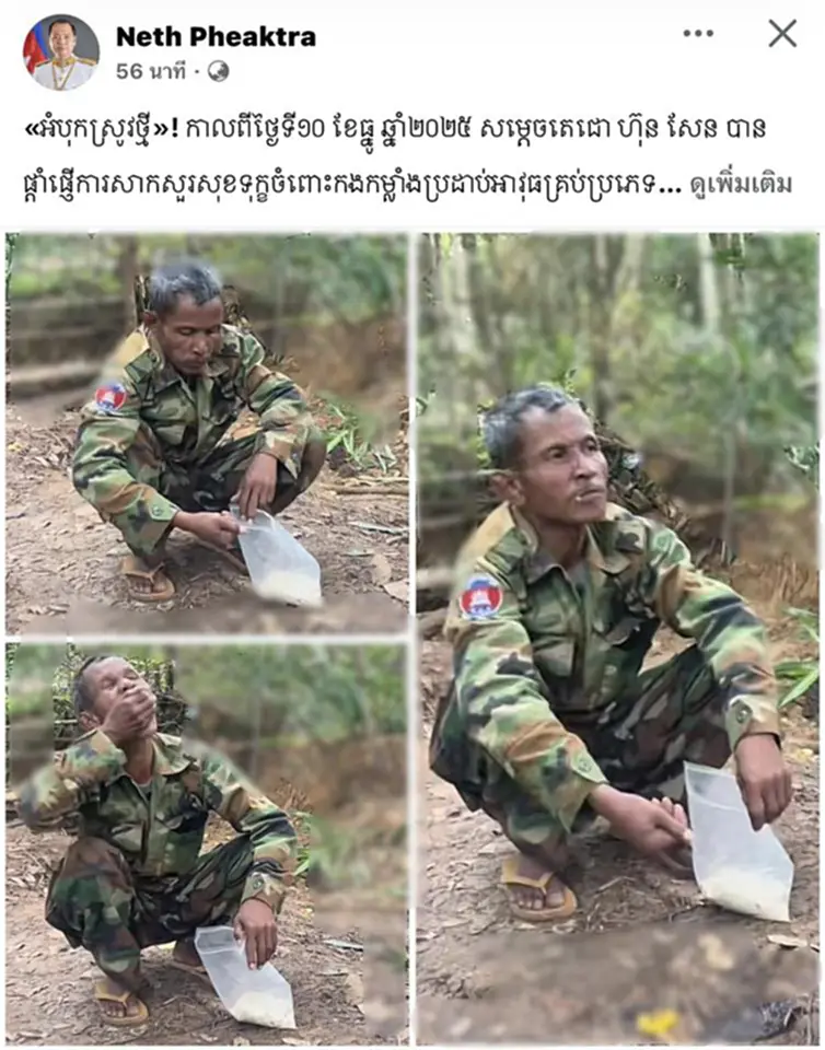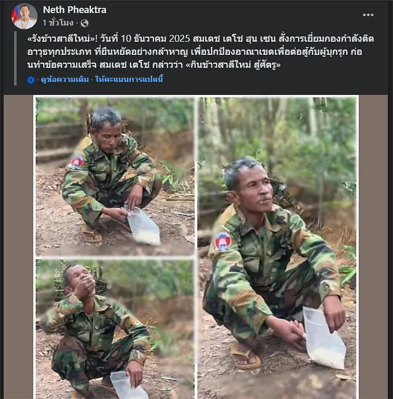 เมื่อวันที่ 12 ธันวาคม 2568 ผู้ใช้เฟซบุ๊ก Neth Pheaktra เจ้าหน้าที่รัฐกระทรวงสารสนเทศของกัมพูชา โพสต์ภาพทหารกัมพูชากำลังกินข้าวอัมบกใหม่ แล้วไปโจมตีไทยศัตรูที่รุกราน ตามคำสั่งของฮุนเซน แปลไทยระบุว่า..