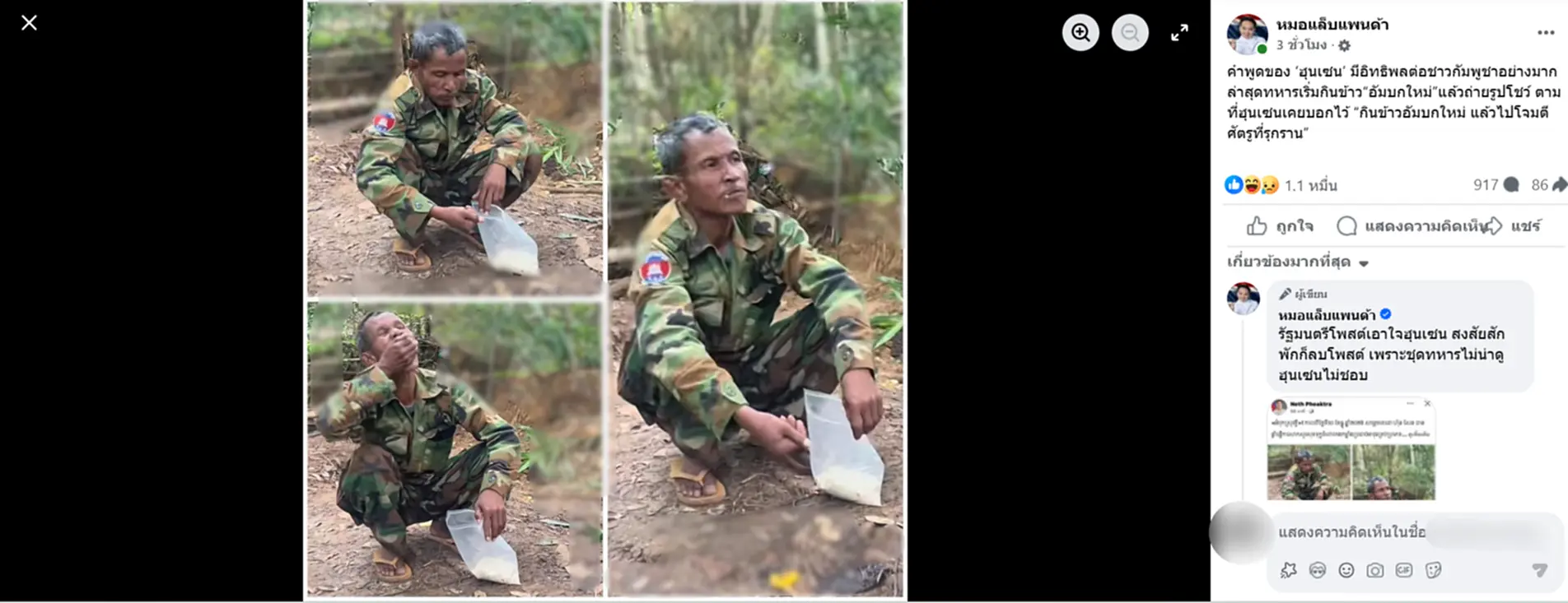ด้าน เพจหมอแล็บแพนด้า โพสต์ข้อความพร้อมภาพ โดยระบุว่า.. คำพูดของ ‘ฮุนเซน’ มีอิทธิพลต่อชาวกัมพูชาอย่างมาก ล่าสุดทหารเริ่มกินข้าว “อัมบกใหม่” แล้วถ่ายรูปโชว์ ตามที่ฮุนเซนเคยบอกไว้ “กินข้าวอัมบกใหม่ แล้วไปโจมตีศัตรูที่รุกราน”