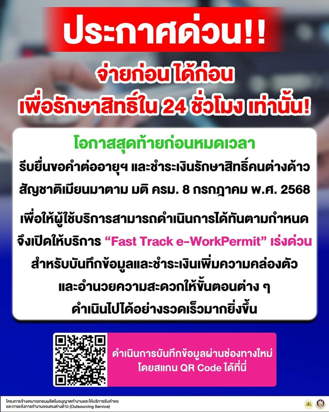 ประกาศด่วน! จ่ายก่อน ได้ก่อน เพื่อรักษาสิทธิ์ใน 24 ชั่วโมง เท่านั้น! รีบยื่นคำขอต่ออายุคนต่างด้าวสัญชาติเมียนมาตาม มติ ครม. 8 ก.ค. พ.ศ. 2568