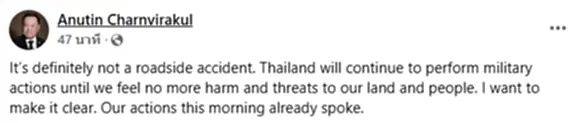 โดยยืนยันว่า กรณีที่เกิดขึ้น ไม่ใช่อุบัติเหตุข้างทางแน่นอน ประเทศไทย จะยังคงดําเนินการทางทหารต่อไปจนกว่าเราจะไม่มีอันตรายและคุกคามต่อแผ่นดินและผู้คนของเราอีกต่อไป เพราะเราอยากทําให้มันชัดเจน ซึ่งการกระทําของเราเช้านี้ได้แสดงให้เห็นแล้ว”