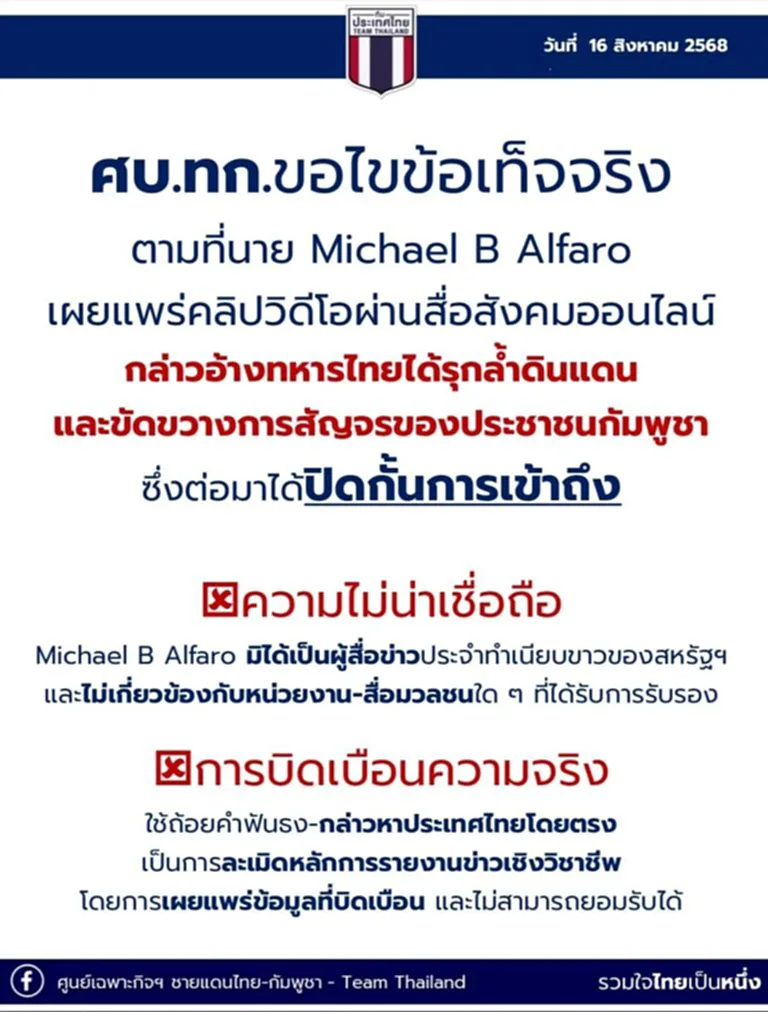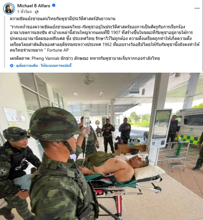 15 ธ.ค. 2568 ผู้ใช้เฟซบุ๊กชาวต่างชาติ “Michael B Alfaro ” นักล็อบบี้ยิสต์ชาวอเมริกัน ออกมาโพสต์ข้อความ เป็นภาษาอังกฤษว่า“Cambodia Thai Border Conflict Has a Long History