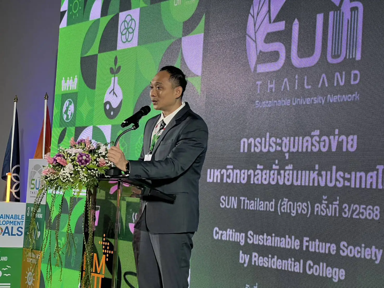 เพื่อแลกเปลี่ยนองค์ความรู้และขับเคลื่อนการพัฒนามหาวิทยาลัยสู่ความยั่งยืนอย่างเป็นรูปธรรม โดยมี รองศาสตราจารย์ ดร.สุวิทย์ แซ่เตีย อธิการบดี มจธ. กล่าวต้อนรับ และ รองศาสตราจารย์ ดร.ณัฐพงศ์ มกระธัช ประธานเครือข่ายมหาวิทยาลัยยั่งยืนแห่งประเทศไทย (SUN Thailand) ประจำปี 2568 กล่าวรายงานการจัดประชุม ซึ่งจัดขึ้นภายใต้ธีม “Crafting Sustainable Future Society by Residential College” มุ่งสร้างสังคมแห่งความยั่งยืนผ่านกระบวนการเรียนรู้แบบอาศรมวิชาการ