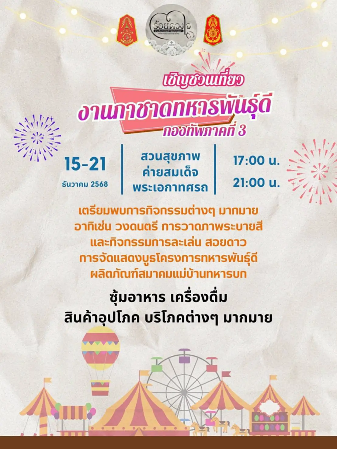 ตามที่ พลโท วรเทพ บุญญะ แม่ทัพภาคที่ 3 ได้ริเริ่มให้มีการจัดกิจกรรม “งานกาชาดทหารพันธุ์ดี กองทัพภาคที่ 3” ประจำปี 2568 ขึ้น โดยได้มอบหมายให้หน่วยกองบัญชาการช่วยรบที่ 3 และหน่วยทหารภายในพื้นที่กองทัพภาคที่ 3 ที่ดำเนินโครงการทหารพันธุ์ดี ร่วมจัดงานกาชาด คู่ขนานกับส่วนกลาง เพื่อจำหน่ายผลผลิตในโครงการอีกทางหนึ่ง
