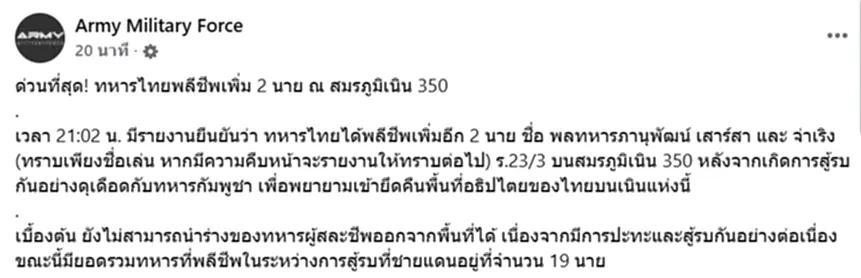 วันที่ 16 ธ.ค. 68 เพจเฟซบุ๊ก Army Military Force โพสต์ภาพพร้อมระบุข้อความว่า ด่วนที่สุด! ทหารไทยพลีชีพเพิ่ม 2 นาย ณ สมรภูมิเนิน 350