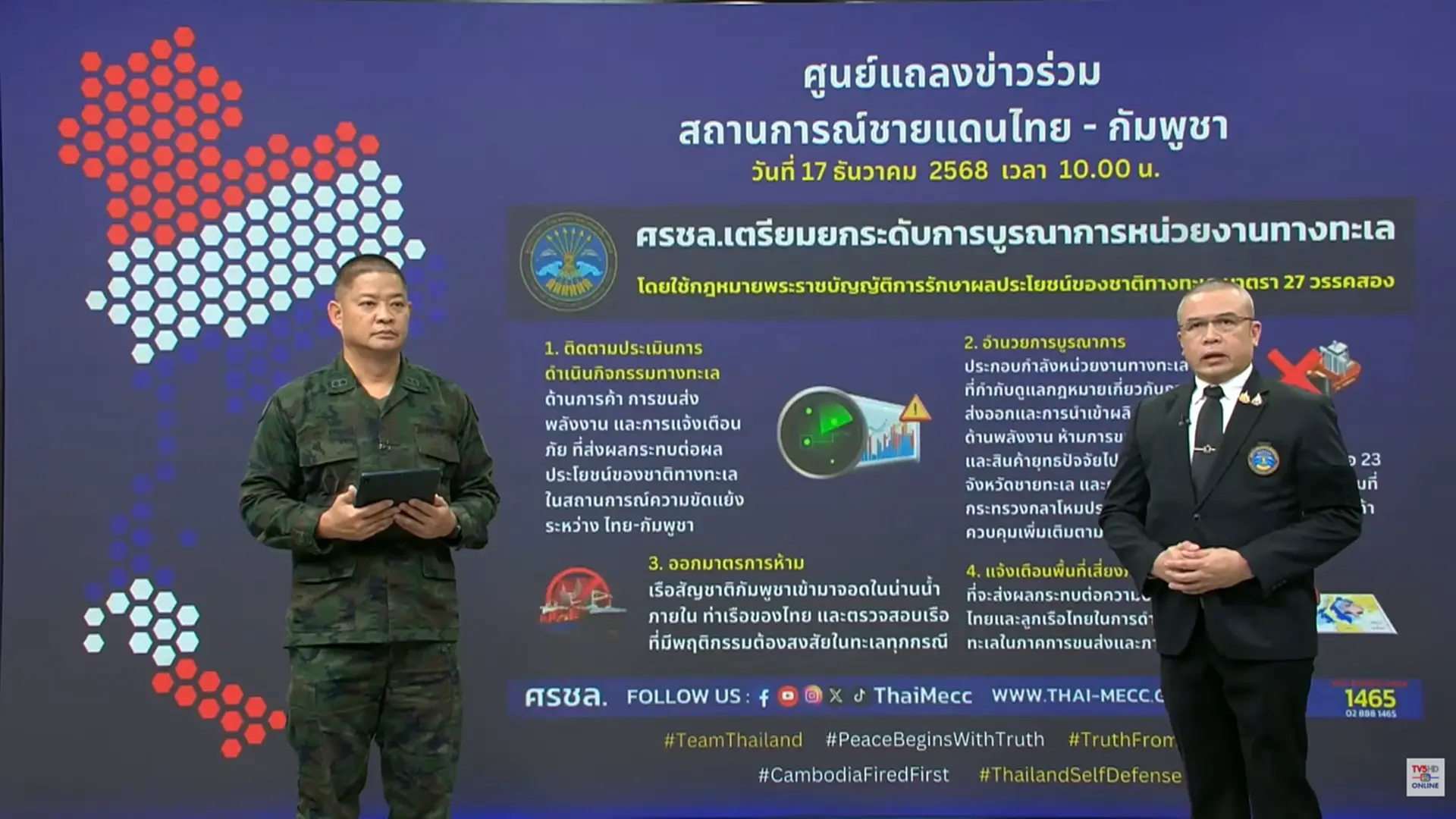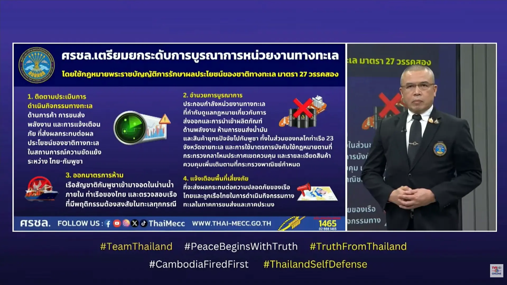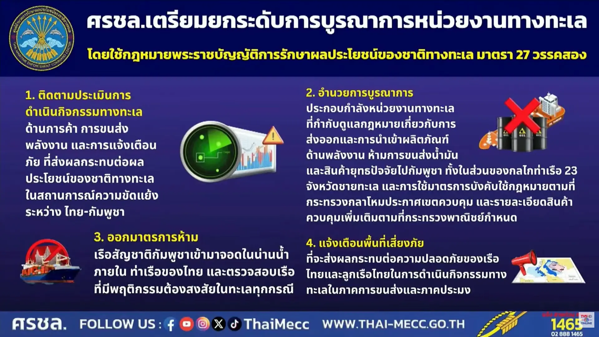 เมื่อวันที่ 17 ธันวาคม 2568 เวลา 10.00 น. ที่ศูนย์แถลงข่าวร่วมสถานการณ์ชายแดนไทย-กัมพูชา พลเรือตรีจุมพล นาคบัว โฆษกศูนย์อำนวยการรักษาผลประโยชน์ของชาติทางทะเล หรือ ศรชล. กล่าวว่า ศรชล.เตรียมยกระดับการบูรณาการหน่วยงานทางทะเล เพื่อรองรับมติของสภาความมั่นคงแห่งชาติ หรือ สมช.ในการดําเนินการเกี่ยวกับขนส่งสินค้าด้านพลังงานและการส่งสินค้ายุทธปัจจัยไปในพื้นที่กัมพูชา โดยการดําเนินการได้แบ่งออกเป็น 4 ด้าน ดังนี้