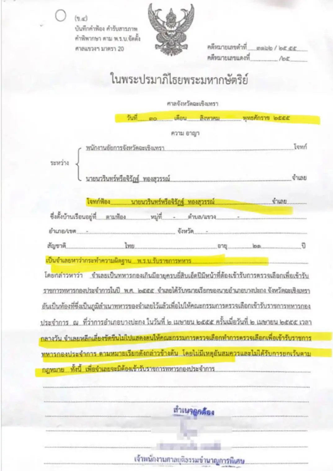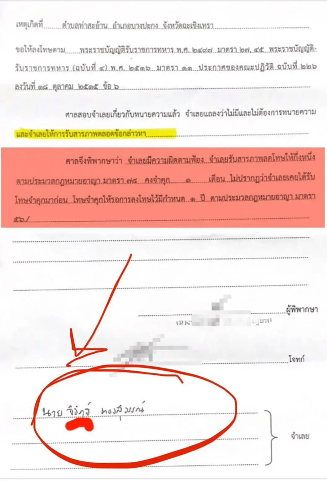 ท้ายที่สุด ศาลวินิจฉัยว่า การกระทำดังกล่าวส่งผลกระทบต่อกระทรวงกลาโหม ประชาชน และกระทบความเชื่อมั่นต่อระบบการเกณฑ์ทหาร อันเกี่ยวกับความมั่นคงของชาติ จึงลงโทษฐานใช้เอกสารราชการปลอม โดยพิพากษาจำคุกตามที่ปรากฏในคำพิพากษาชั้นต้น ข้อหาอื่นให้ยก