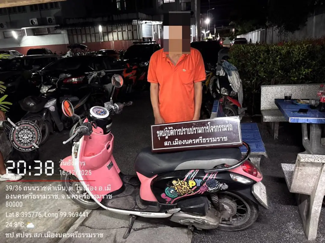 เจ้าหน้าที่สามารถจับกุมได้ ณ บริเวณซอยเตาหม้อ ถนนสะพานยาว ต.โพธิ์เสด็จ อ.เมือง จ.นครศรีธรรมราช พร้อมของกลางรถจักรยานยนต์ ยี่ห้อฮอนด้า รุ่นสคูปปี้ไอ สีขาว-ชมพู หมายเลขทะเบียน 1 กฌ 101 สงขลา ซึ่งถูกลักขโมยมาจากพื้นที่ชุมชนสถานีรถไฟ ต.คลัง อ.เมือง จ.นครศรีธรรมราช