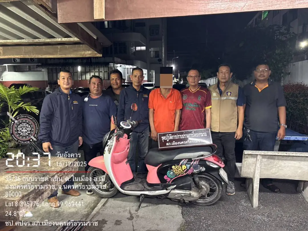 ผู้สื่อข่าวรายงานว่า เมื่อวันที่ 16 ธ.ค. 2568 ที่ผ่านมา ภายใต้การอำนวยการของ พล.ต.ต.เกรียงศักดิ์ นุ่นเกลี้ยง ผบก.ภ.จว.นครศรีธรรมราช พ.ต.อ.จักรวรรดิ บุญทวีกุลสวัสดิ์ รอง ผบก.ภ.จว.นครศรีธรรมราช พ.ต.อ.สุทัศน์ สงสยม รอง ผบก.ภ.จว.นครศรีธรรมราช พ.ต.อ.กิตติชัย ไกรนราช ผกก.สภ.เมือง นศ. สั่งการให้ พ.ต.ท.นรากร เอียดช่วย รอง ผกก.ป.สภ.เมือง นศ. พ.ต.ต.สรยุทธ์ สุวรรณโชติ สวป.สภ.เมือง นศ. ร.ต.อ.พละพล คงฉ่ำ รอง สวป.สภ.เมือง นศ./หน.ชป.ศปจร. พร้อมเจ้าหน้าที่ชุด ศปจร.จับกุมนายณรงค์ อายุ 51 ปี ในข้อหาลักทรัพย์รถจักรยานยนต์ในเวลากลางคืน หรือรับของโจร