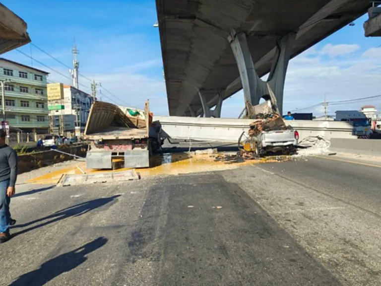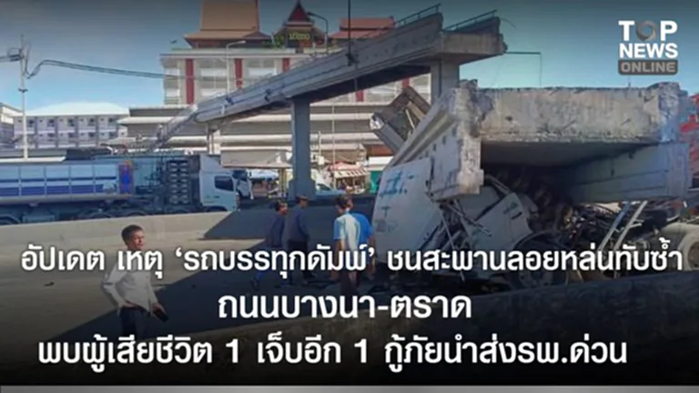 อัปเดต “รถบรรทุกดัมพ์” ชนสะพานลอยหล่นทับซ้ำ ถนนบางนา-ตราด เจอศพผู้เสียชีวิต 1 เจ็บอีก 1 กู้ภัยนำส่งรพ.ด่วน