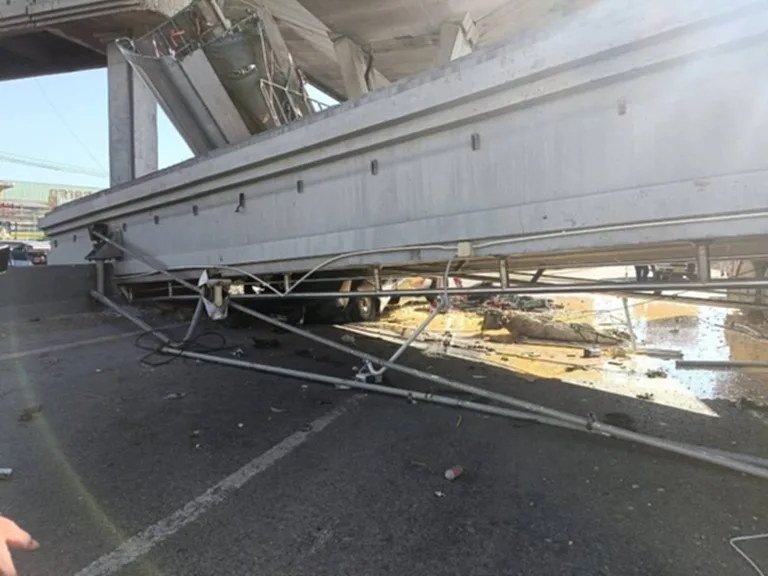 ขณะเกิดเหตุมีผู้พบเห็นเหตุการณ์รายงานว่า เห็นส่วนดั้มของรถบรรทุกอยู่ในลักษณะยกสูงค้างอยู่ ก่อนจะชนคานสะพานลอยและทำให้คานเคลื่อนตัวร่วงลงทับตัวรถบรรทุกและรถข้างเคียง ส่งผลให้คานกีดขวางทุกช่องจราจรบนทางหลักฝั่งขาเข้า