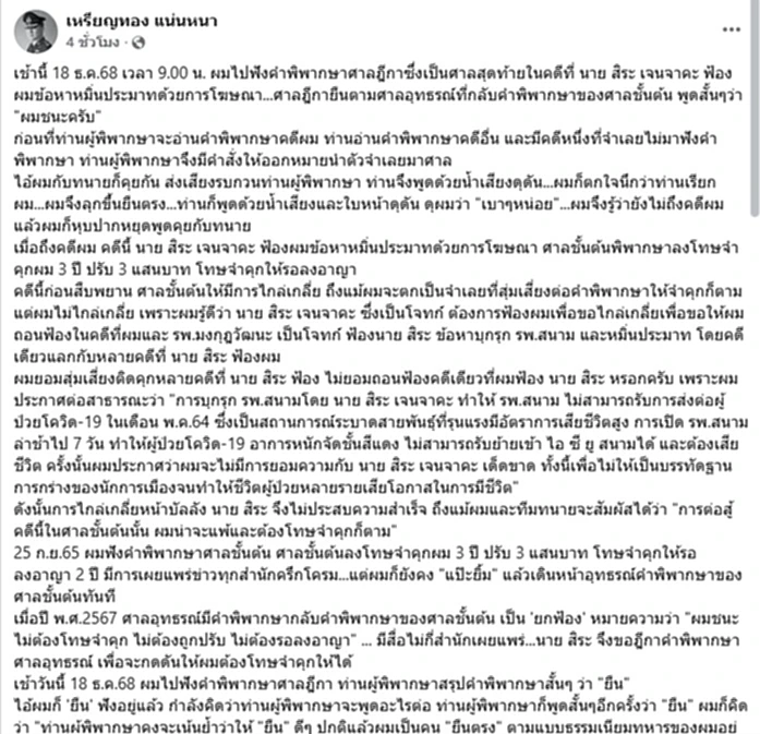 ดังนั้นการไกล่เกลี่ยหน้าบัลลัง นาย สิระ จึงไม่ประสบความสำเร็จ ถึงแม้ผมและทีมทนายจะสัมผัสได้ว่า “การต่อสู้คดีนี้ในศาลชั้นต้นนั้น ผมน่าจะแพ้และต้องโทษจำคุกก็ตาม” 25 ก.ย.65 ผมฟังคำพิพากษาศาลชั้นต้น ศาลชั้นต้นลงโทษจำคุกผม 3 ปี ปรับ 3 แสนบาท โทษจำคุกให้รอลงอาญา 2 ปี มีการเผยแพร่ข่าวทุกสำนักครึกโครม…แต่ผมก็ยังคง “แป๊ะยิ้ม” แล้วเดินหน้าอุทธรณ์คำพิพากษาของศาลชั้นต้นทันที เมื่อปี พ.ศ.2567 ศาลอุทธรณ์มีคำพิพากษากลับคำพิพากษาของศาลชั้นต้น เป็น ‘ยกฟ้อง’ หมายความว่า “ผมชนะ ไม่ต้องโทษจำคุก ไม่ต้องถูกปรับ ไม่ต้องรอลงอาญา” … มีสื่อไม่กี่สำนักเผยแพร่…นาย สิระ จึงขอฎีกาคำพิพากษาศาลอุทธรณ์ เพื่อจะกดดันให้ผมต้องโทษจำคุกให้ได้
