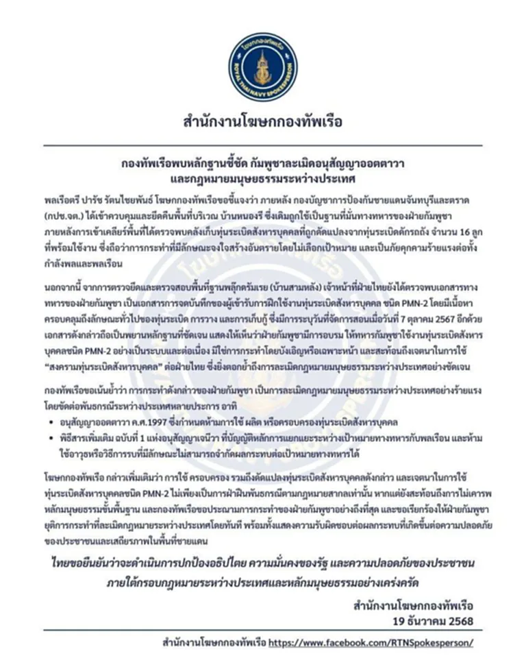 โฆษกกองทัพเรือ กล่าวเพิ่มเติมว่า การใช้ ครอบครอง รวมถึงดัดแปลงทุ่นระเบิดสังหารบุคคลดังกล่าว และเจตนาในการใช้ทุ่นระเบิดสังหารบุคคลชนิด PMIN-2 ไม่เพียงเป็นการฝ่าฝืนพันธกรณีตามกฎหมายสากลเท่านั้น หากแต่ยังสะท้อนถึงการไม่เคารพหลักมนุษยธรรมขั้นพื้นฐาน และกองทัพเรือขอประณามการกระทำของฝ่ายกัมพูชาอย่างถึงที่สุด และขอเรียกร้องให้ฝ่ายกัมพูชายุติการกระทำที่ละเมิดกฎหมายระหว่างประเทศโดยทันที พร้อมทั้งแสดงความรับผิดชอบต่อผลกระทบที่เกิดขึ้นต่อความปลอดภัยของประชาชนและเสถียรภาพในพื้นที่ชายแดน