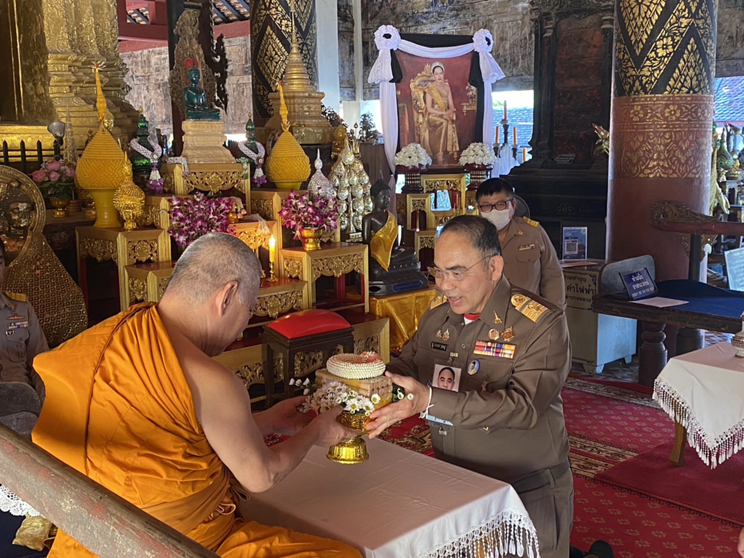 หลังเสร็จภารกิจตรวจเยี่ยมและให้ขวัญกำลังใจฯ องคมนตรี และคณะได้เดินทางสักการะองค์พระธาตุลำปางหลวง พระเจ้าร้านทอง พระประธานในวิหารหลวง กราบนมัสการพระครูพิธานนพกิจ รองเจ้าคณะอำเภอเกาะคา, เจ้าอาวาสวัดพระธาตุลำปางหลวง และถวายเครื่องไทยธรรม และสักการะพระแก้วมรกต (พระแก้วดอนเต้า) พระพุทธรูปคู่บ้านคู่เมืองของจังหวัดลำปาง ก่อนออกเดินทางไปจังหวัดเชียงใหม่