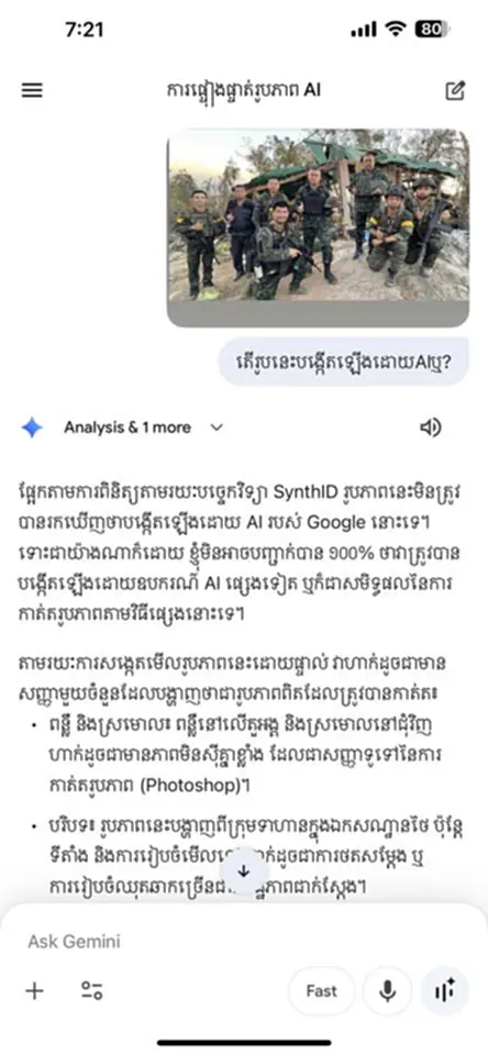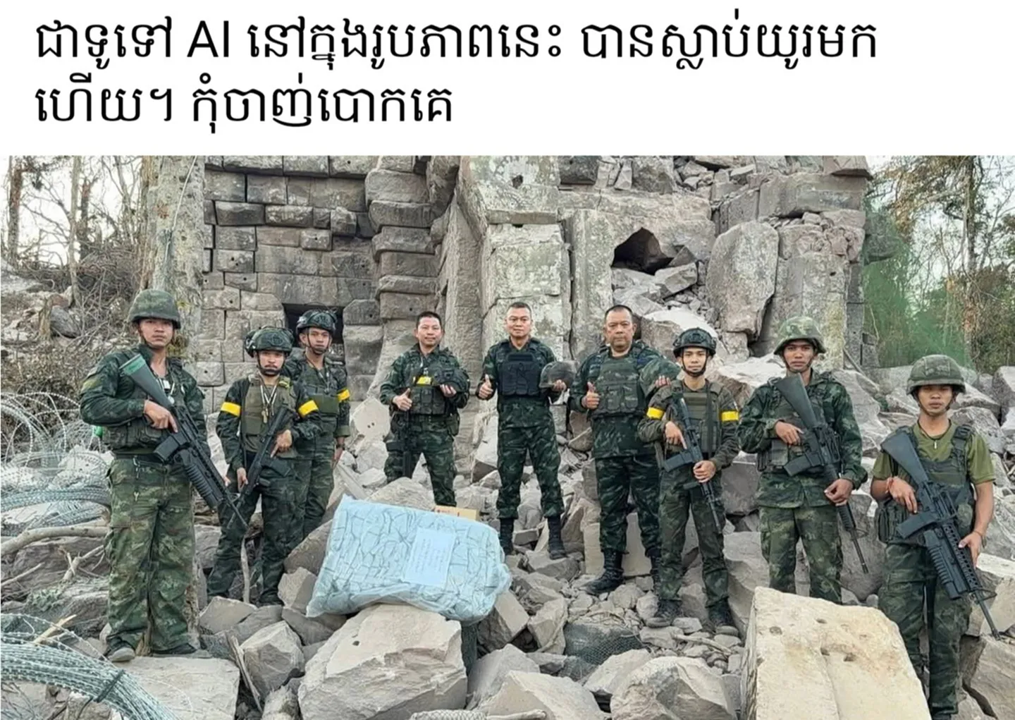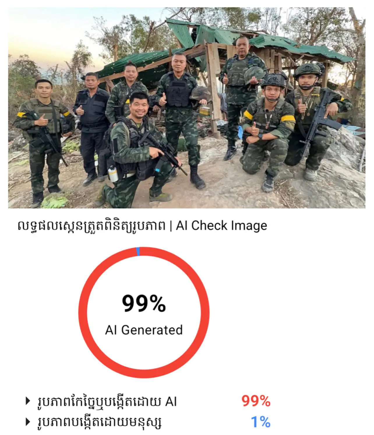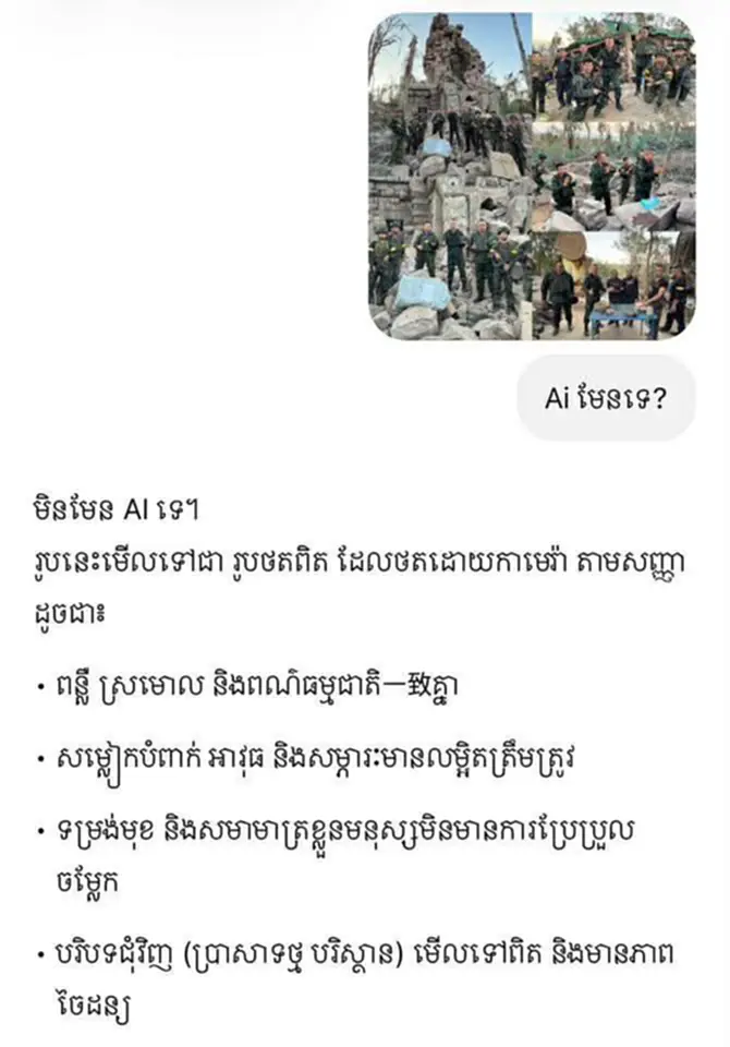 ล่าสุดวันนี้ (21 ธ.ค.68) พบว่าเพจ IO กัมพูชารับไม่ได้กับความพ่ายแพ้ ถึงขั้นใช้ AI สร้างรูปบิดเบือนความจริง กรณีที่ พลโท บุญสิน ลงพื้นที่ปราสาทตาควาย โดยเพจ IO ได้สร้างภาพปลอมขึ้นมา ให้ดูเหมือนเป็นการจัดฉากว่าเป็นนการถ่ายทำในสตูดิโอ แล้วนำไปโพสต์ปั่นกระแสหลอกคนกัมพูชาด้วยกันว่า “ประเทศไทยกำลังหลอกคนไทยทั้งประเทศ” และอ้างว่าอดีตแม่ทัพของไทยไม่ได้ลงพื้นที่จริง และทหารกัมพูชายังคงรักษาปราสาทตาควายไว้ได้อย่างแข็งแกร่ง