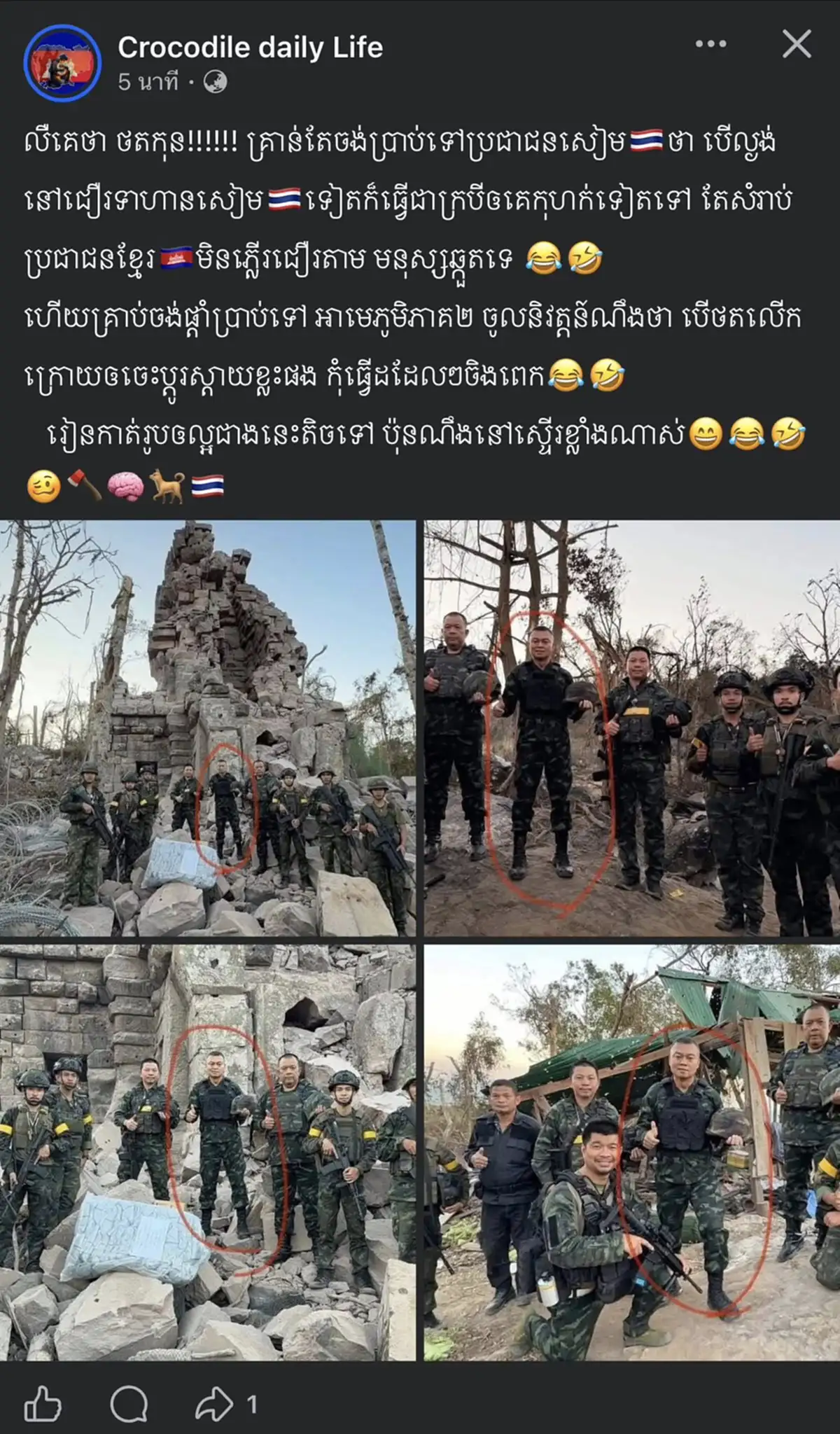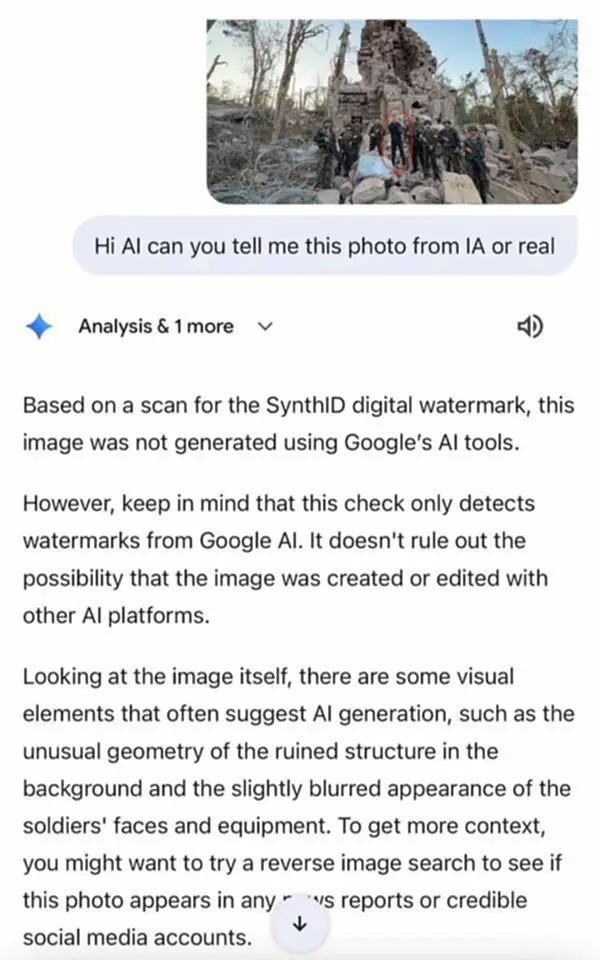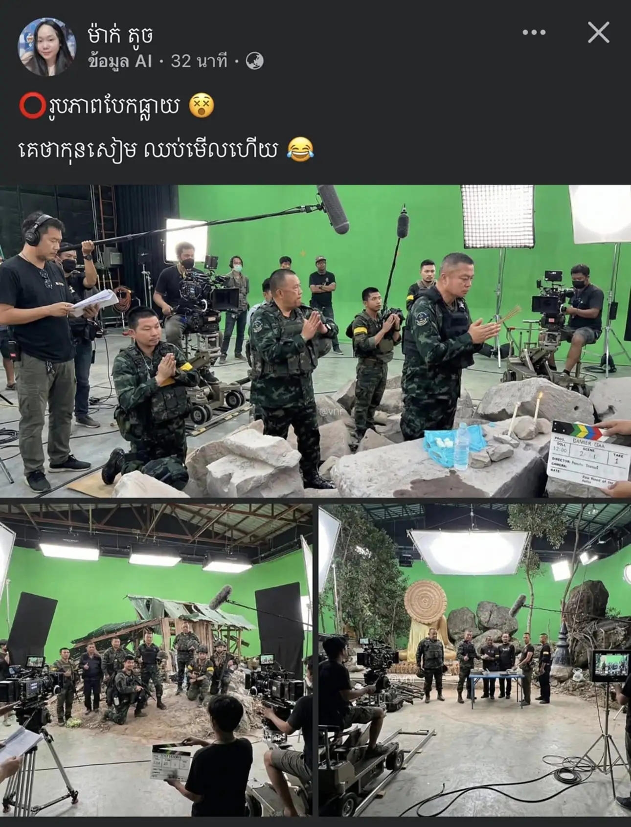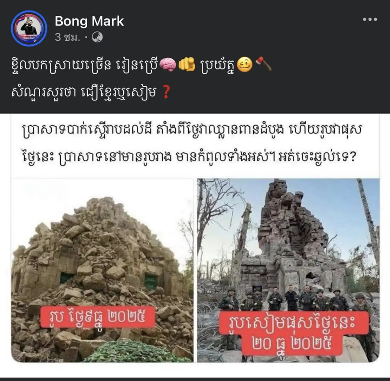 ล่าสุดวันนี้ (21 ธ.ค.68) พบว่าเพจ IO กัมพูชารับไม่ได้กับความพ่ายแพ้ ถึงขั้นใช้ AI สร้างรูปบิดเบือนความจริง กรณีที่ พลโท บุญสิน ลงพื้นที่ปราสาทตาควาย โดยเพจ IO ได้สร้างภาพปลอมขึ้นมา ให้ดูเหมือนเป็นการจัดฉากว่าเป็นนการถ่ายทำในสตูดิโอ แล้วนำไปโพสต์ปั่นกระแสหลอกคนกัมพูชาด้วยกันว่า “ประเทศไทยกำลังหลอกคนไทยทั้งประเทศ” และอ้างว่าอดีตแม่ทัพของไทยไม่ได้ลงพื้นที่จริง และทหารกัมพูชายังคงรักษาปราสาทตาควายไว้ได้อย่างแข็งแกร่ง