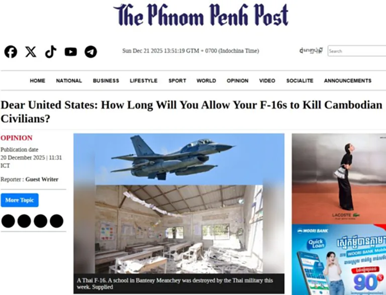 เนียง โซเพียบ นักวิเคราะห์กัมพูชาได้เขียนบทความผ่านเดอะ พนมเปญโพสต์เมื่อวานนี้ (เสาร์ที่ 20 ธค.) มีข้อความแนวตัดพ้อว่าก่อนหน้านี้สหรัฐได้เรียกร้องให้มีการยับยั้งชั่งใจ รวมทั้งให้มีการหยุดยิง ซึ่งกัมพูชาซาบซึ้งในความพยายามทางการทูตของประธานาธิบดีโดนัลด์ ทรัมป์ ซึ่งแสดงให้เห็นถึงบทบาทที่สร้างสรรค์ แต่ความซาบซึ้งเพียงอย่างเดียวไม่สามารถปกป้องชีวิตได้เพราะไทยเพิกเฉยต่อการเรียกร้องของสหรัฐ ซ้ำแล้วซ้ำเล่า พร้อมกับเรียกร้องให้สหรัฐออกมาดำเนินการกดดันไทยมากกว่าแค่ใช้คำพูด
