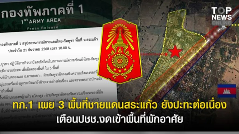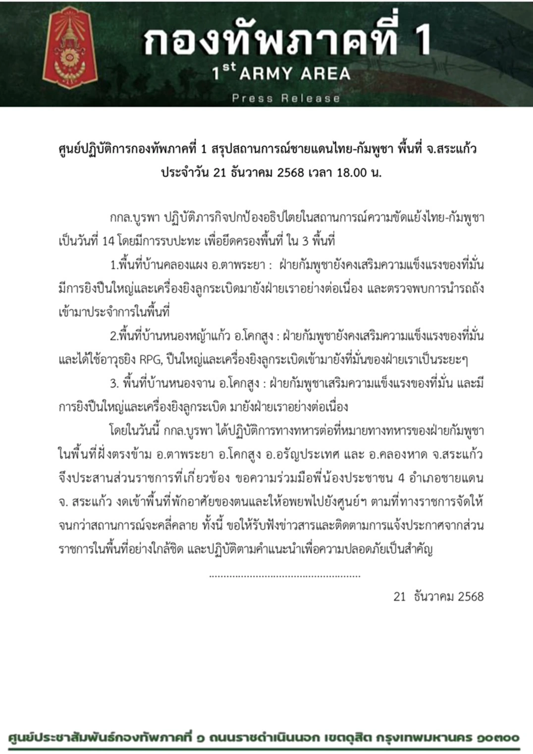 เมื่อวันที่ 21 ธันวาคม 2568 เวลา 18.00 น. ศูนย์ปฏิบัติการกองทัพภาคที่ 1 สรุปสถานการณ์ชายแดนไทย-กัมพูชา พื้นที่จังหวัดสระแก้ว โดยกองกำลังบูรพาปฏิบัติภารกิจปกป้องอธิปไตย เป็นวันที่ 14 โดยมีการรบปะทะ เพื่อยึดครองพื้นที่ ใน 3 พื้นที่ ดังนี้