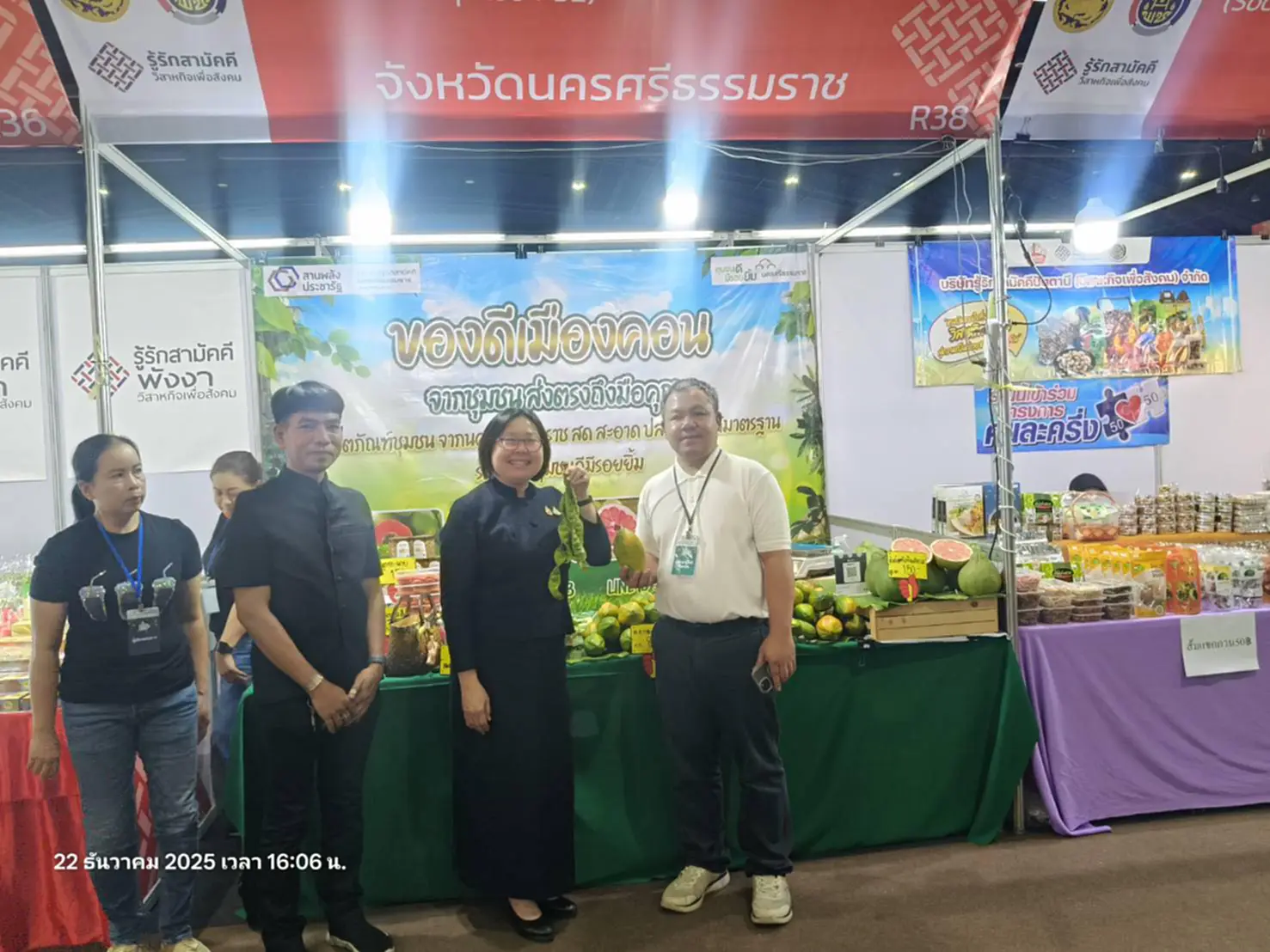 ในโอกาสนี้ รองผู้ว่าราชการจังหวัดนครศรีธรรมราช ได้เยี่ยมชม ให้กำลังใจ และอุดหนุนสินค้าจากผู้ผลิต ผู้ประกอบการ OTOP ภายในงานด้วย สำหรับจังหวัดนครศรีธรรมราช มีผลิตภัณฑ์เข้าร่วมจัดจำหน่ายในงานเป็นประเภทอาหาร เครื่องดื่ม ผ้าและเครื่องแต่งกาย ของใช้ ของตกแต่ง ของที่ระลึก และสมุนไพร ระดับ 3-5 ดาว สินค้า OTOP และของขวัญของฝาก จำนวน 64 กลุ่ม/ราย รวมทั้งสิ้น 59 บูท มียอดรายได้จากการจำหน่ายในวันนี้ (22 ธ.ค.68) เป็นเงิน 2,787,020 บาท และตั้งเป้ายอดการ จำหน่ายสะสม ระหว่างวันที่ 20 – 28 ธันวาคม 2568 จำนวน 7,168,980 บาท