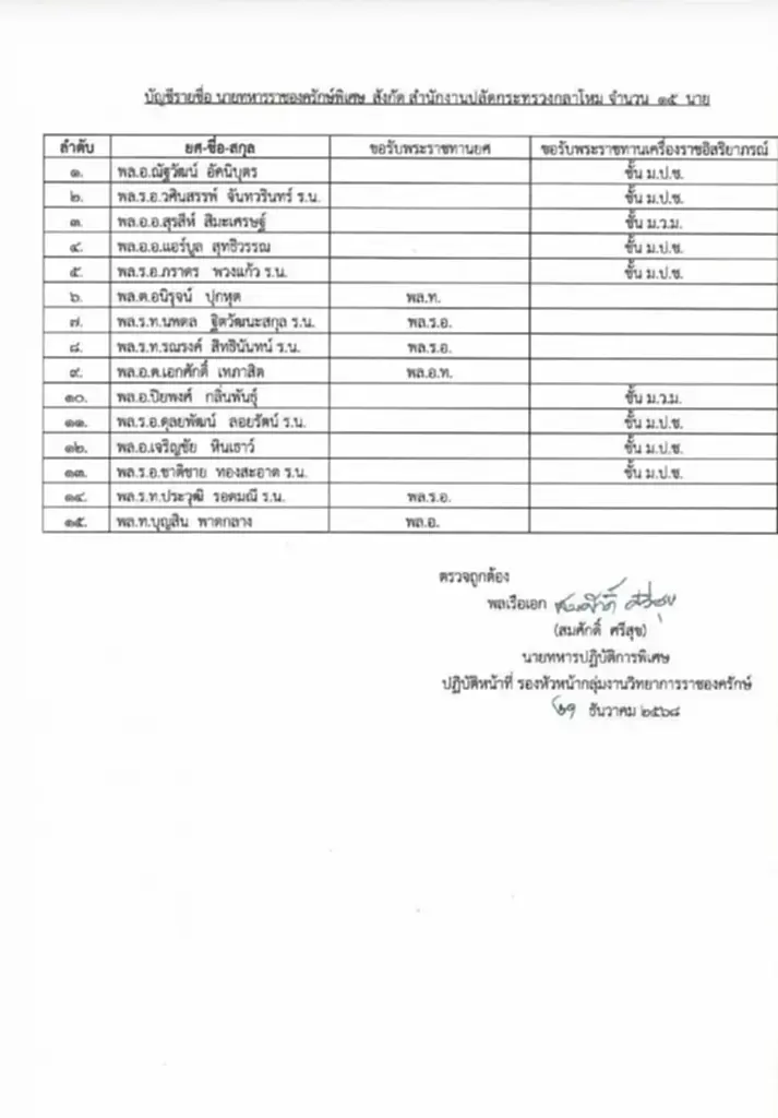 วันที่ 23 ธ.ค. 68 รายงานข่าวแจ้งว่า พล.ร.อ.วีระศักดิ์ อ๊อกกังวาล ผู้บัญชาการสำนักราชองครักษ์ประจำพระองค์ พระที่นั่งอัมพรสถาน ทำหนังสือถึงปลัดกระทรวงกลาโหม ลงวันที่ 21 ธ.ค. เรื่อง ทรงพระกรุณาโปรดเกล้าฯ พระราชทานยศทหาร และพระราชทานเครื่องราชอิสริยาภรณ์ เป็นกรณีพิเศษ ให้นายทหารองครักษ์พิเศษ
