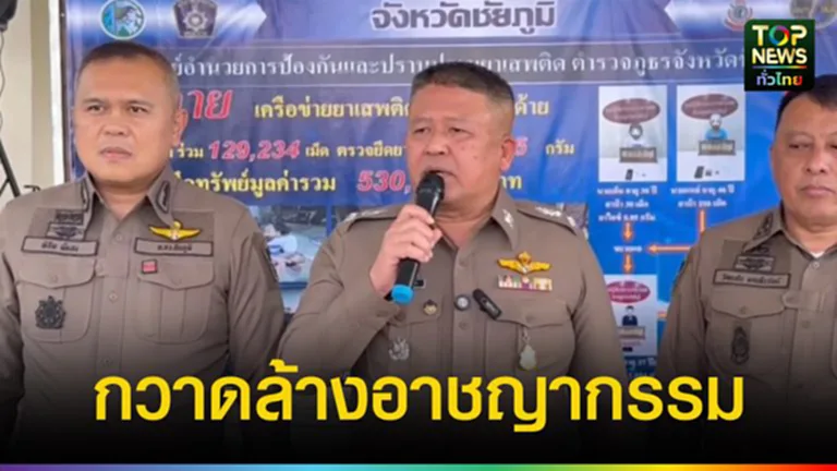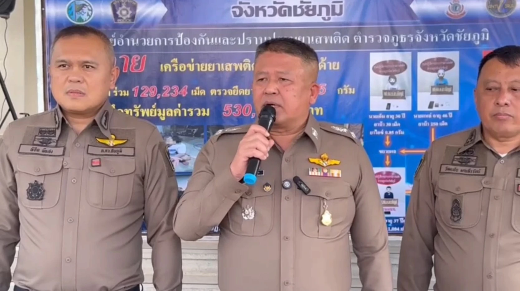 วันที่ (23 ธ.ค. 68) ตามนโยบาย “เด็ดปีกนักค้าผู้ยิ่งใหญ่” ของ พล.ต.อ.กิตติ์รัฐ พันธุ์เพ็ชร์ ผบ.ตร. และ พล.ต.ท.สมประสงค์ เย็นท้วม ผู้ช่วย ผบ.ตร. ภายใต้การอำนวยการของ พล.ต.ต.สุจริต ปาณเล็ก ผบก.ภ.จว.ชัยภูมิ และ นายอนันต์ นาคนิยม ผู้ว่าราชการจังหวัดชัยภูมิ ได้สั่งการให้ชุดปฏิบัติการปราบปรามยาเสพติด ภ.จว.ชัยภูมิ เปิดปฏิบัติการเชิงรุกกวาดล้างเครือข่ายยาเสพติดในพื้นที่จังหวัดชัยภูมิ ซึ่งมีผลการปฏิบัติการครั้งนี้ สามารถจับกุมผู้ต้องหารวม 4 ราย พร้อมของกลางรายการสำคัญประกอบด้วย:ยาบ้ารวม 129,234 เม็ด ยาไอซ์ 0.85 กรัม ตรวจยึดทรัพย์สิน: รถยนต์กระบะ 1 คัน และรถจักรยานยนต์ 1 คัน รวมมูลค่ากว่า 530,000 บาท