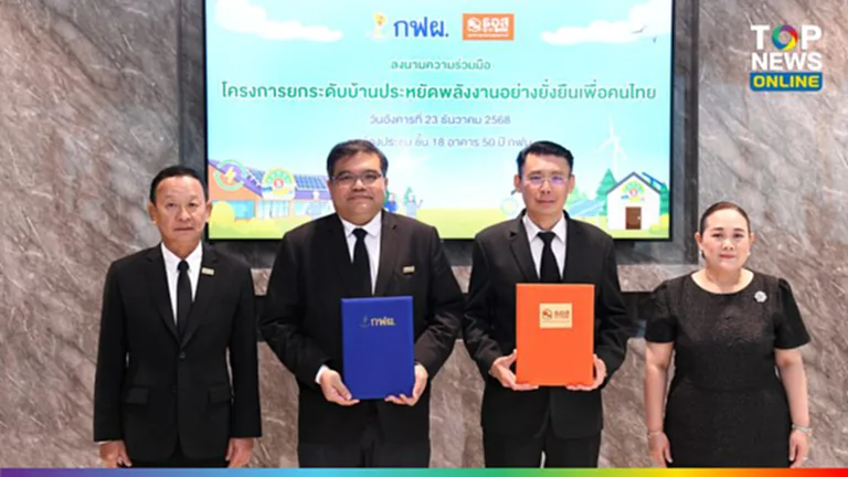 นายวฤต รัตนชื่น รองผู้ว่าการยุทธศาสตร์ การไฟฟ้าฝ่ายผลิตแห่งประเทศไทย (กฟผ.) พร้อมด้วย นายณรงค์พล ประภานิรินธน์ รองกรรมการผู้จัดการ กลุ่มงานการตลาด และรักษาการผู้อำนวยการศูนย์ข้อมูลอสังหาริมทรัพย์ธนาคารอาคารสงเคราะห์ (ธอส.) ร่วมลงนามความร่วมมือโครงการยกระดับบ้านประหยัดพลังงานอย่างยั่งยืน เพื่อคนไทย โดยมีผู้บริหารของทั้งสองหน่วยงานร่วมเป็นสักขีพยาน ณ สำนักงานใหญ่ กฟผ. จ.นนทบุรี เมื่อวันที่ 23 ธันวาคม 2568