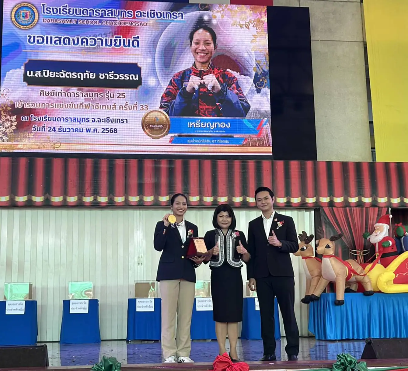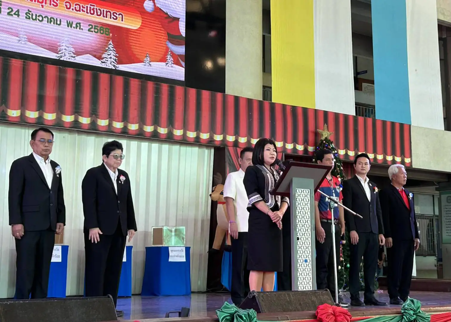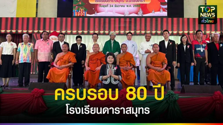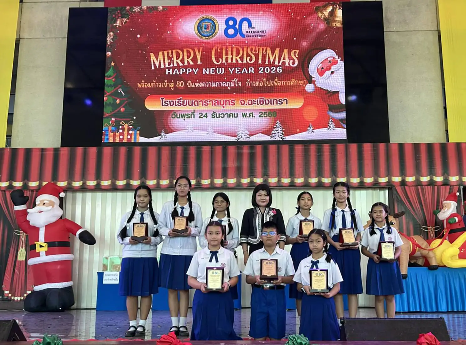 วันพุธที่ 24 ธันวาคม 2568 เวลา 08.00 น. ณ โรงเรียนดาราสมุทร ตำบลนครเนื่องเขต อำเภอเมืองฉะเชิงเทรา จังหวัดฉะเชิงเทรา นางสาวฉัตรประอร นิยม ผู้ว่าราชการจังหวัดฉะเชิงเทรา เป็นประธานงานเฉลิมฉลองครบรอบ 80 ปี โรงเรียนดาราสมุทร ภายใต้ชื่องาน “Darasamut Charity 2025” ควบคู่กับการเฉลิมฉลองเทศกาลคริสต์มาสและวันขึ้นปีใหม่ 2026 ในโอกาสนี้ ได้รับความเมตตาจาก พระเทพภาวนาวชิรคุณ วิ. เจ้าอาวาสวัดโสธรวราราม วรวิหาร เจ้าคณะจังหวัดฉะเชิงเทรา (ผู้แทนศาสนาพุทธ) บาทหลวง ดร.เอกรัตน์ หอมประทุม ผู้ช่วยพระสังฆราชฝ่ายการศึกษา ผู้อำนวยการฝ่ายการศึกษา อัครสังฆมณฑลกรุงเทพฯ (ผู้แทนศาสนาคริสต์) และ ดร.สุวิทย์ สลามเต๊ะ ผู้พิพากษาสมทบศาลเยาวชนและครอบครัว จังหวัดพระนครศรีอยุธยา ผู้ปกครอง (ผู้แทนศาสนาอิสลาม) ร่วมพิธีเปิดงานในครั้งนี้ด้วย ในโอกาสนี้ผู้ว่าราชการจังหวัดฉะเชิงเทราได้ร่วมเคารพธงชาติ และยืนสงบนิ่ง เป็นเวลา 93 วินาที เพื่อน้อมแสดงความอาลัยสมเด็จพระนางเจ้าสิริกิติ์ พระบรมราชินีนาถ พระบรมราชชนนีพันปีหลวง