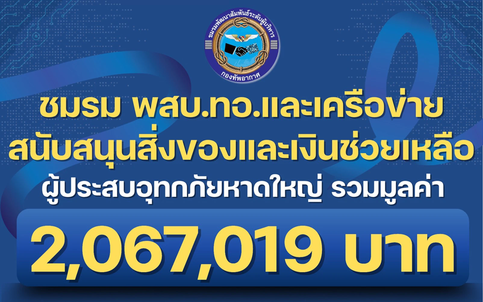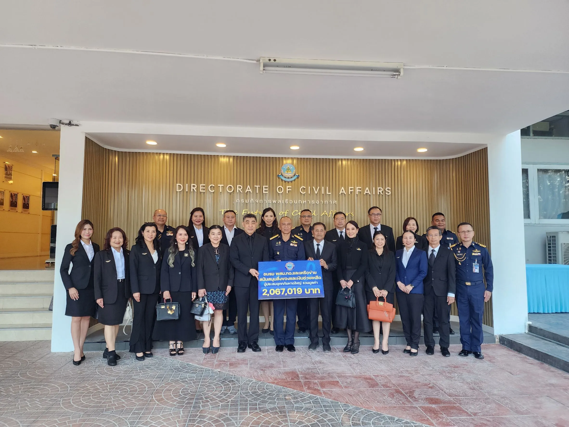 ชมรมพัฒนาสัมพันธ์ระดับผู้บริหารกองทัพอากาศ (พสบ.ทอ.) ร่วมกับภาคีเครือข่ายภาคเอกชน และผู้บริหารจากหลากหลายหลักสูตรชั้นสูงระดับประเทศ ส่งมอบความห่วงใย กำลังใจ และพลังสนับสนุน เพื่อช่วยเหลือพี่น้องผู้ประสบอุทกภัยในพื้นที่อำเภอหาดใหญ่ จังหวัดสงขลา ซึ่งมียอดเงินและสิ่งของบริจาคมูลค่ารวมทั้งสิ้น 2,067,019 บาท ผ่านกรมกิจการพลเรือนทหารทหารอากาศ โดย พลอากาศโท ประสิทธิ์ ดำรงค์ปรีชา เจ้ากรมกิจการพลเรือนทหารอากาศ เป็นผู้แทนรับมอบเงินและสิ่งของเพื่อส่งต่อไปยังผู้ประสบภัย สำหรับการขนส่งสิ่งได้ดำเนินการผ่านศูนย์ประสานงานรับ-ส่งต่อความช่วยเหลือผู้ประสบอุทกภัย ซึ่งตั้งอยู่ที่พิพิธภัณฑ์กองทัพอากาศและการบินแห่งชาติ โดยได้ดำเนินการจัดส่งถึงมือผู้ที่ได้รับความเดือดร้อนเรียบร้อยแล้ว