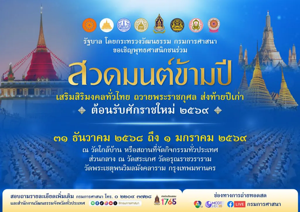 กระทรวงวัฒนธรรม โดยกรมการศาสนา บูรณาการความร่วมมือกับหน่วยงานภาครัฐและภาคเอกชนจัดงานสวดมนต์ข้ามปีภายใต้ชื่อ “สวดมนต์ข้ามปี เสริมสิริมงคลทั่วไทย ถวายพระราชกุศล ส่งท้ายปีเก่า ต้อนรับศักราชใหม่ 2569” ระหว่างวันที่ 31 ธ.ค.68 – 1 ม.ค. 69 เพื่อสืบทอดพระพุทธศาสนา ถวายพระราชกุศลแด่พระบาทสมเด็จพระเจ้าอยู่หัว และสมเด็จพระนางเจ้าฯพระบรมราชินี ตลอดจนพระบรมวงศานุวงศ์ รวมทั้งเพื่อความเป็นสิริมงคล และเกิดความสุขสงบในจิตใจของประชาชน และสร้างแรงจูงใจให้ประชาชน ลด ละ เลิก อบายมุข ในเทศกาลปีใหม่ ส่งเสริมให้ประชาชนได้สวดมนต์ข้ามปีได้ทุกที่ในช่วงเวลาส่งท้ายปีเก่า ต้อนรับปีใหม่ โดยกรมการศาสนา มุ่งหวังให้กิจกรรมดังกล่าวช่วยส่งเสริมให้ประชาชนได้นำหลักธรรมคำสอน มาบ่มเพาะ เสริมสร้างพลังใจให้มีจิตใจที่ผ่องใส ก่อให้เกิดสิริมงคลแก่ตนเอง ครอบครัว สังคม และประเทศชาติ ในช่วงเทศกาลส่งท้ายปีเก่าต้อนรับปีใหม่