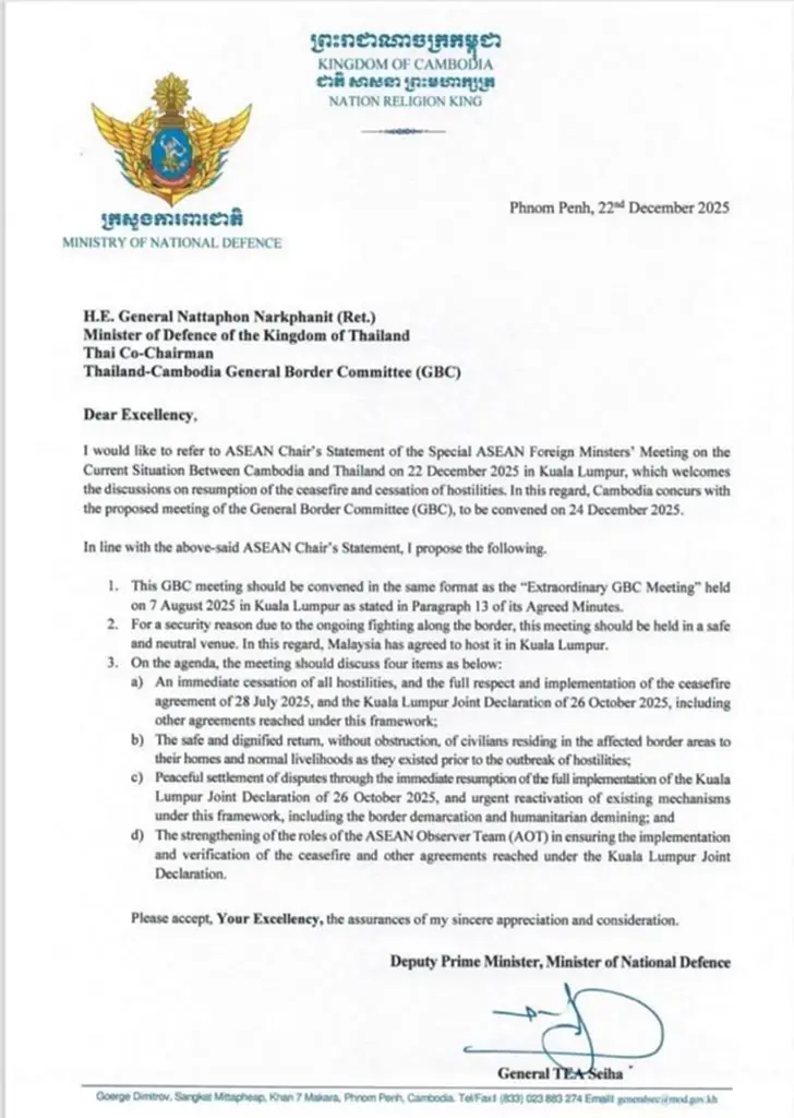 สืบเนื่องจากการที่ ทางกัมพูชาส่งหนังสือทางการ ลงวันที่ 22 ธันวาคม 2568 โดย พลเอก เตีย เซ็ยฮา รัฐมนตรีว่าการกระทรวงกลาโหม กัมพูชา ถึง พล.อ.ณัฐพล นาคพาณิชย์ รัฐมนตรีว่าการกระทรวงกลาโหมของไทย เพื่อแสดงความประสงค์ในการเจรจาหยุดยิง แล้วกลับสู่โต๊ะเจรจาตามกรอบข้อตกลง กัมลาสัมเปอร์ อีกครั้ง