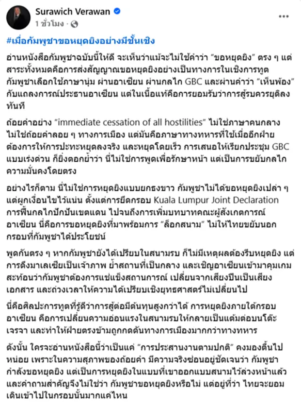 ล่าสุด นายสุรวิชช์ วีรวรรณ คอลัมนิสต์ประจำเครือผู้จัดการ โพสต์เฟซบุ๊กส่วนตัวแสดงความคิดเห็นในเรื่องนี้ว่า #เมื่อกัมพูชาขอหยุดยิงอย่างมีชั้นเชิง อ่านหนังสือกัมพูชาฉบับนี้ให้ดี จะเห็นว่าแม้จะไม่ใช้คำว่า “ขอหยุดยิง” ตรง ๆ แต่สาระทั้งหมดคือการส่งสัญญาณขอหยุดยิงอย่างเป็นทางการในเชิงการทูต กัมพูชาเลือกใช้ภาษานุ่ม ผ่านอาเซียน ผ่านกลไก GBC และผ่านคำว่า “เห็นพ้อง” กับแถลงการณ์ประธานอาเซียน แต่ในเนื้อแท้คือการยอมรับว่าการสู้รบควรยุติลงทันที