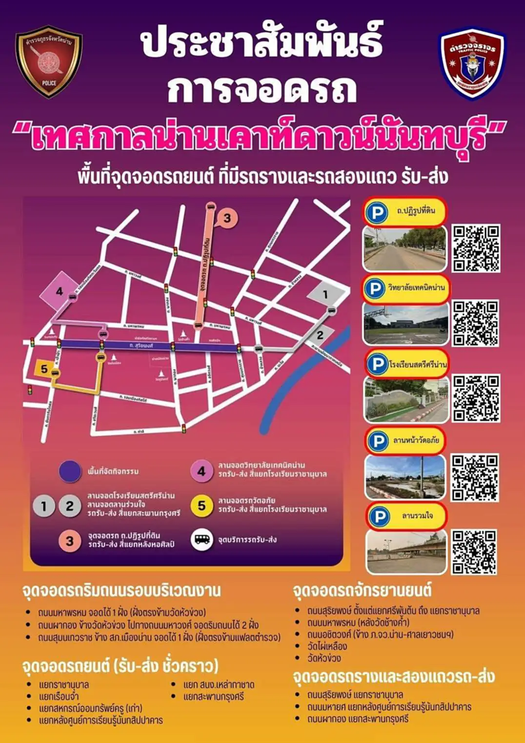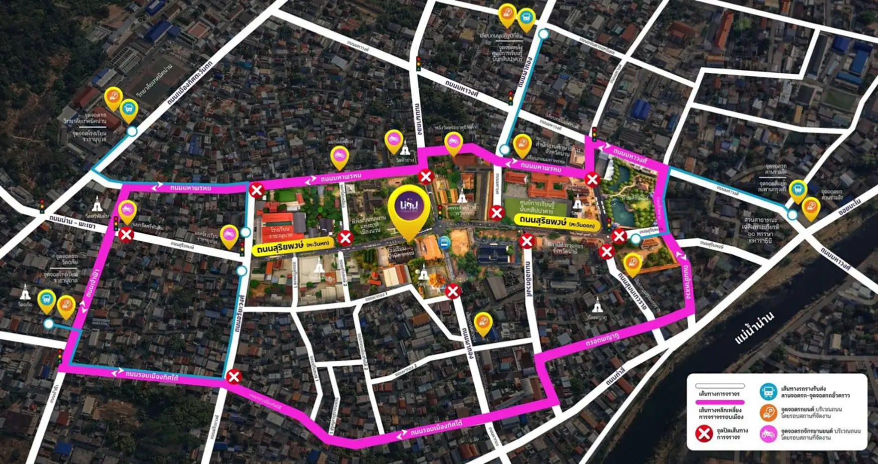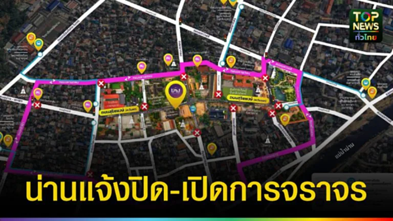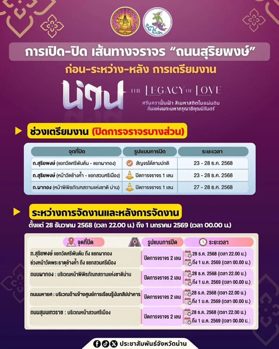 จังหวัดน่าน ขอแจ้งการบริหารจัดการจราจร เพื่อเตรียมความพร้อมสำหรับงาน “Nan The Legacy of Love : น่าน ศรีนคราพื้นฟ้า สิเนหาสถิตในแผ่นดิน” บริเวณถนนสุริยพงษ์ และพื้นที่ใกล้เคียง ขอให้ประชาชนและนักท่องเที่ยวโปรดตรวจสอบเส้นทางล่วงหน้า ช่วงเตรียมการจัดงาน (ปิดการจราจรบางส่วน)