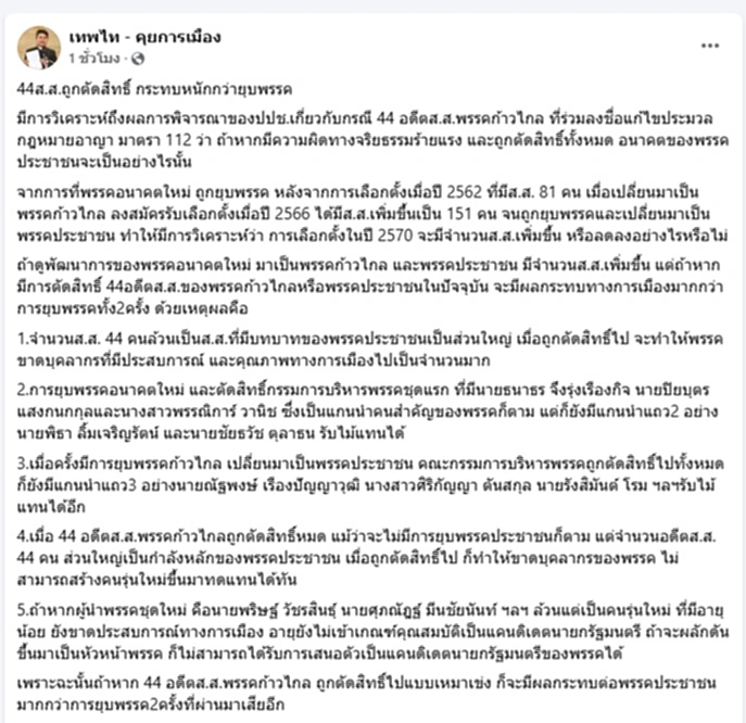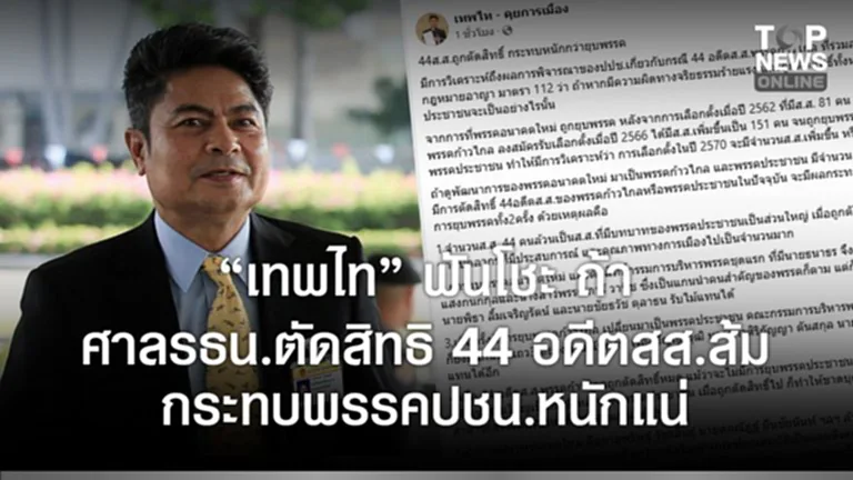 วันที่ 23 กุมภาพันธ์ 2568 นายเทพไท เสนพงศ์ อดีต สส.นครศรีธรรมราช โพสต์ข้อความลงบนเฟซบุ๊ก “เทพไท – คุยการเมือง”  เรื่อง “44 สส.ถูกตัดสิทธิ์ กระทบหนักกว่ายุบพรรค” ระบุว่า 44 สส.ถูกตัดสิทธิ์ กระทบหนักกว่ายุบพรรค