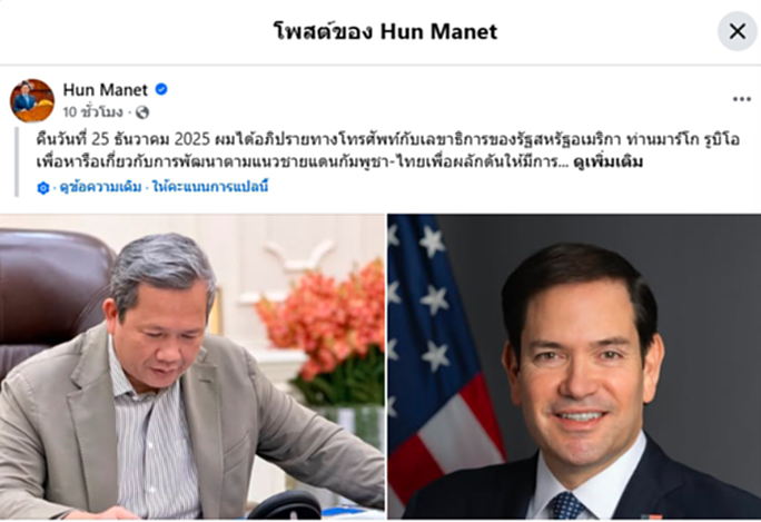 นายกรัฐมนตรีฮุนมาเน็ต ของกัมพูชาแถลงผ่านเว็บเพจเมื่อช่วงเช้าที่ผ่านมา (26 ธค.) เผยว่าตนได้ยกหูโทรศัพท์พูดคุยกับรูบิโอ รัฐมนตรีต่างประเทศสหรัฐเมื่อคืนที่ผ่านมา เพื่อหารือถึงความคืบหน้าสถานการณ์ชายแดนไทย-กัมพูชา ซึ่งรูบิโอเน้นย้ำอีกครั้งว่าประธานาธิบดีโดนัลด์ ทรัมป์ ต้องการเห็นสันติภาพที่ยั่งยืนที่บริเวณพรมแดนของสองประเทศ รวมทั้งต้องการไทยและกัมพูชายึดมั่นในปฏิญญากัวลาลัมเปอร์ที่มีการลงนามกันเมื่อปลายเดือนตุลาคม 2568