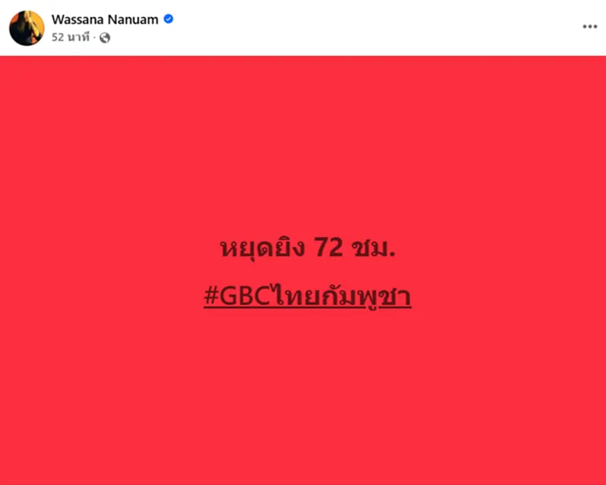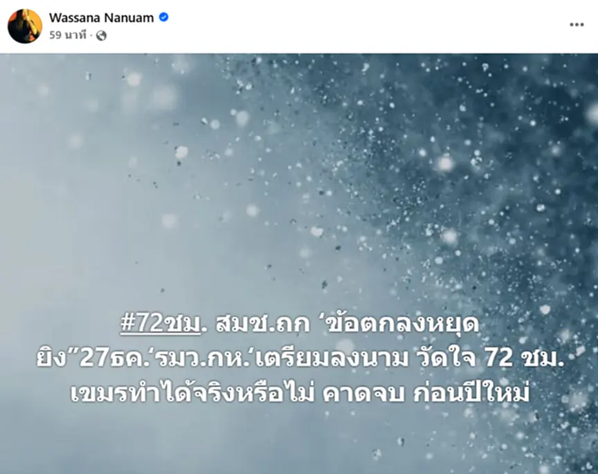 ทางด้าน เพจเฟซบุ๊ก “วาสนา นาน่วม” ผู้สื่อข่าวอาวุโส สายทหาร โพสต์ข้อความว่า “#72ชม. สมช.ถก ‘ข้อตกลงหยุดยิง”27ธค.‘รมว.กห.‘เตรียมลงนาม วัดใจ 72 ชม. เขมรทำได้จริงหรือไม่ คาดจบ ก่อนปีใหม่ ” และ หยุดยิง 72 ชม. #GBCไทยกัมพูชา