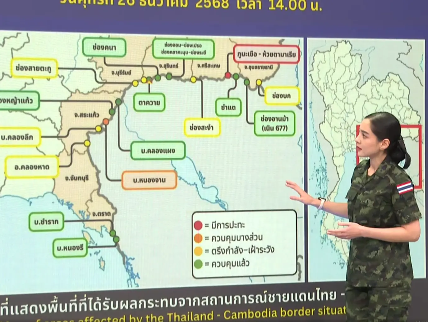 เมื่อวันที่ 26 ธันวาคม 2568 ที่ศูนย์แถลงข่าวร่วมสถานการณ์ไทย-กัมพูชา พันตรีหญิง กัญญ์ณณัฐ พรนิพัทธ์กุล ผู้ช่วยโฆษกกองทัพบก กล่าวว่า ในพื้นที่กองทัพภาคที่ 1 บริเวณบ้านหนองจาน อำเภอโคกสูง จังหวัดสระแก้ว ขณะนี้กำลังทหารอยู่ระหว่างการปฏิบัติการเข้าควบคุมพื้นที่ พร้อมขอให้ประชาชนส่งกำลังใจให้ทหารแนวหน้า และติดตามข้อมูลข่าวสารจากทางราชการ เพื่อรับทราบข้อมูลที่ถูกต้องและคำนึงถึงความปลอดภัยเป็นหลัก ส่วนพื้นที่บ้านหนองหญ้าแก้วและบ้านคลองแผง จังหวัดสระแก้ว ภายหลังทหารไทยเข้าควบคุมพื้นที่ได้แล้ว อยู่ระหว่างการสถาปนาความมั่นคง โดยยังพบว่าฝ่ายกัมพูชามีการยิงโจมตีอย่างต่อเนื่อง อย่างไรก็ตาม กำลังทหารไทยได้ตอบโต้ตามสถานการณ์และสามารถควบคุมพื้นที่ไว้ได้