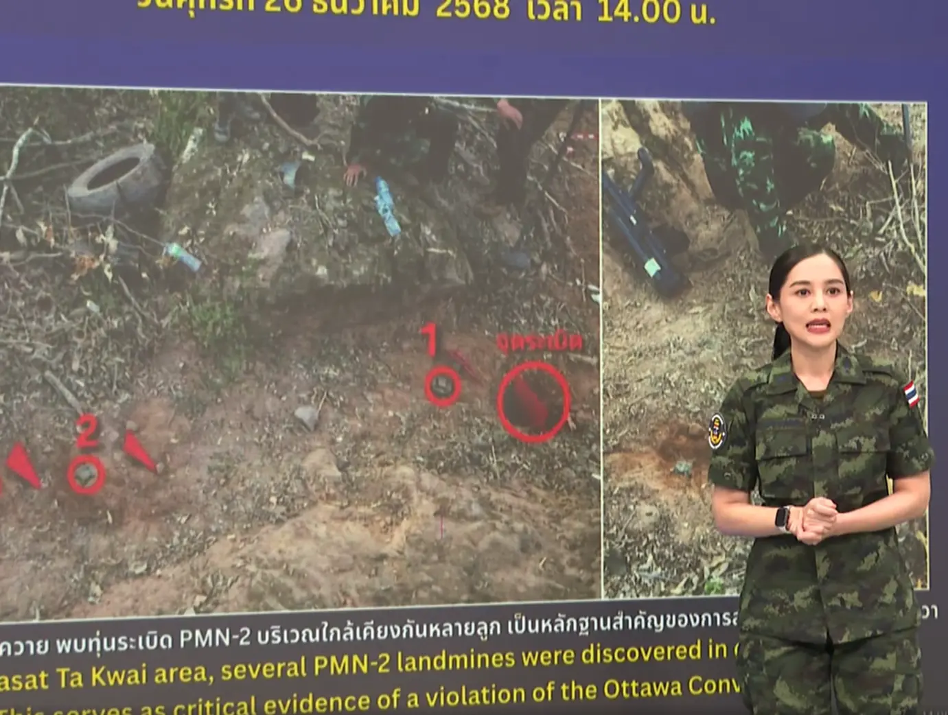พันตรีหญิง กัญญ์ณณัฐ กล่าวอีกว่า ขณะที่พื้นที่กองทัพภาคที่ 2 ยังมีการปะทะเป็นบางจุด โดยเฉพาะบริเวณภูมะเขือและห้วยตามาเรีย จังหวัดศรีสะเกษ ฝ่ายกัมพูชายังคงใช้อาวุธโจมตีกำลังทหารไทย แต่ฝ่ายไทยได้ตอบโต้และควบคุมสถานการณ์ได้เช่นกัน ส่วนเหตุการณ์ในพื้นที่ปราสาทตาควาย จังหวัดสุรินทร์ จากกรณีที่เมื่อวานนี้ (25 ธ.ค.68) กำลังพลชุดเก็บกู้ทุ่นระเบิดของทหารไทยประสบเหตุ จากทุ่นระเบิดสังหารบุคคลชนิด PMN-2 ทำให้มีผู้ได้รับบาดเจ็บ 2 นาย ต่อมาเมื่อมีการเข้าพิสูจน์ทราบพื้นที่เพิ่มเติม พบจุดระเบิดเดิมและตรวจพบทุ่นระเบิดชนิดเดียวกันเพิ่มเติมอีก 4 ทุ่น วางเรียงตามแนวเส้นทางการเคลื่อนกำลังพล ซึ่งสะท้อนถึงเจตนามุ่งทำร้ายเจ้าหน้าที่ทหารไทย รวมถึงผู้ที่จะเข้าช่วยเหลือหากเกิดเหตุ