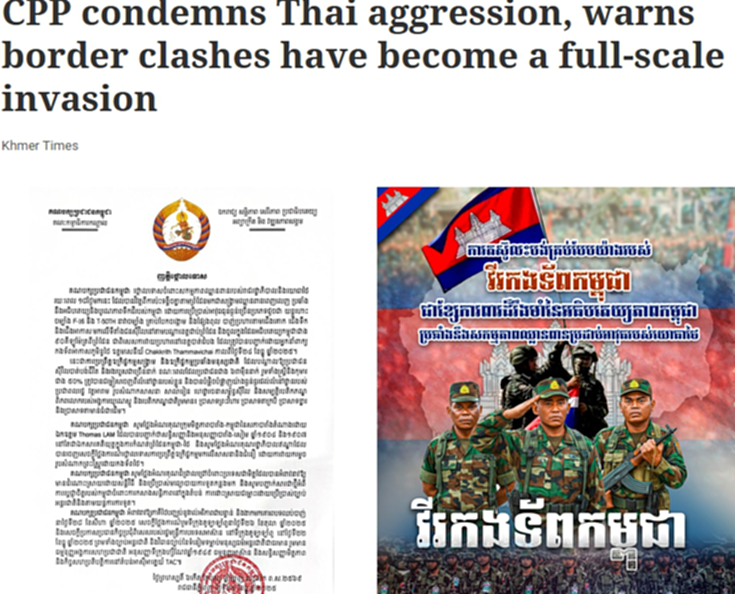 ขแมร์ไทม์สรายงานว่าคณะกรรมการกลางของพรรคประชาชนกัมพูชาหรือ CPP ซึ่งเป็นพรรครัฐบาลได้ออกแถลงการณ์เมื่อวานนี้ (25 ธค.) กล่าวหารัฐบาลและกองทัพไทยว่ากำลังเปลี่ยนจากการปะทะที่แนวชายชายแดนไปสู่การรุกรานอย่างเต็มรูปแบบ และว่าพรรครัฐบาลขอออกแถลงการณ์ประณามการกระทำที่ก้าวร้าวของไทยต่อกัมพูชาอย่างรุนแรง ที่ละเมิดอธิปไตยและบูรณภาพแห่งดินแดนของกัมพูชาโดยมีการใช้อาวุธหนัก รวมถึงเครื่องบินรบ, เรือรบ, คลัสเตอร์บอมบ์ และควันพิษ โดยโจมตีทั้งทางบก ทางทะเล และทางอากาศ นอกจากนี้ก็มีการโจมตีพื้นที่ชุมชนตามจังหวัดชายแดน รวมทั้งมีการรุกล้ำเข้ามาในดินแดนกัมพูชามากกว่า 90 กิโลเมตร ซึ่งรวมถึงจังหวัดพระตะบอง