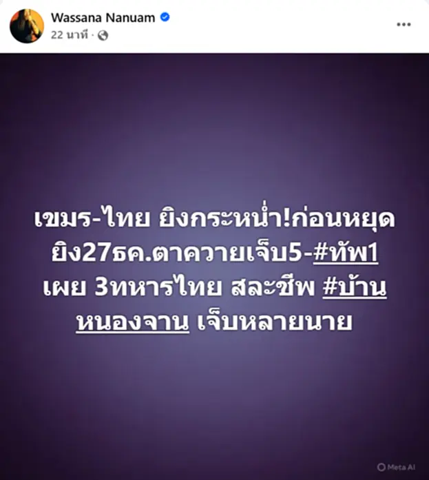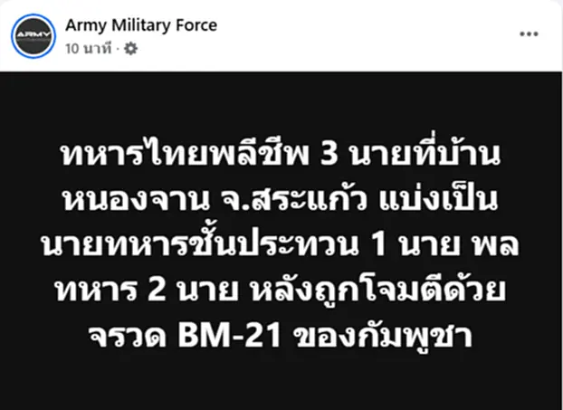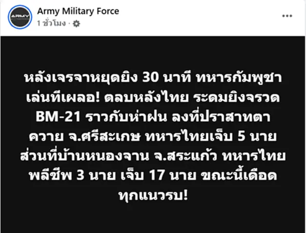 วันที่ 26 ธ.ค.68 เวลา 18.40 น. เพจเฟซบุ๊ก Army Military Force รายงานว่า หลังการเจรจาหยุดยิง 30 นาทีต่อมา ทหารกัมพูชาเล่นทีเผลอ ตลบหลังทหารไทย ระดมยิงจรวด BM-21 ราวกับห่าฝน ลงที่ปราสาทตาควาย ทหารไทยได้รับบาดเจ็บ 5 นาย และที่บ้านหนองจาน อำเภอโคกสูง จังหวัดสระแก้ว ทหารไทยพลีชีพ 3 นาย ประกอบทหารยศนายสิบ 1 นาย พลทหาร 2 นาย และได้รับบาดเจ็บอีก 17 นาย
