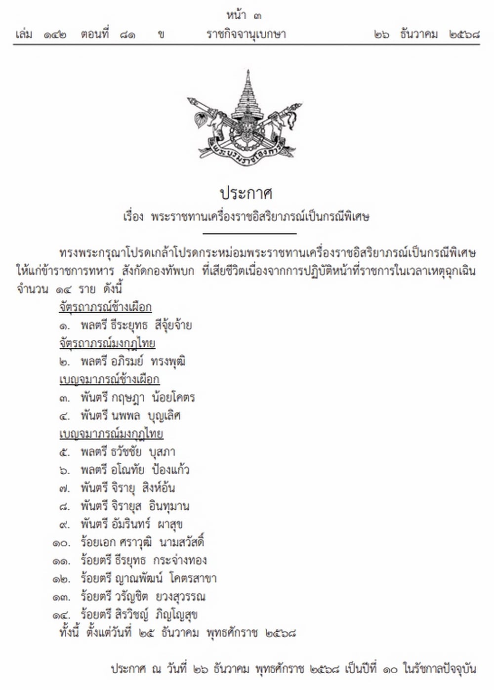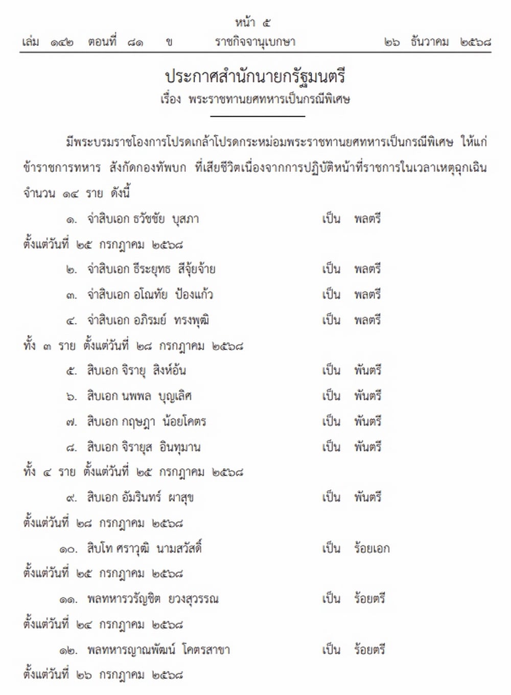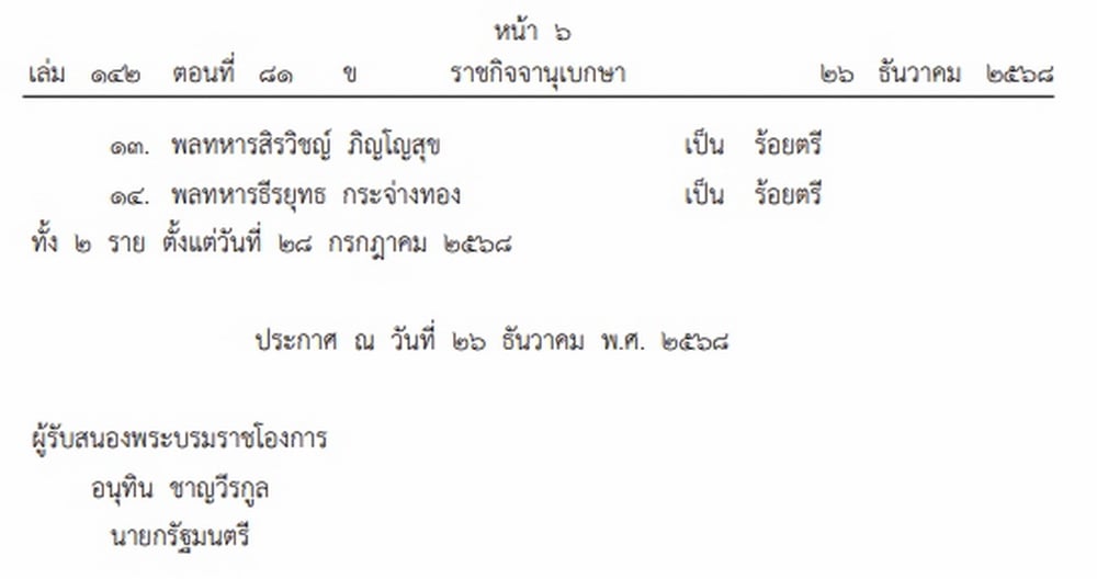 วันที่ 26 ธันวาคม 2568 เว็บไซต์ราชกิจจานุเบกษา เผยแพร่ประกาศสำนักนายกรัฐมนตรี เรื่อง พระราชทานยศทหารเป็นกรณีพิเศษ