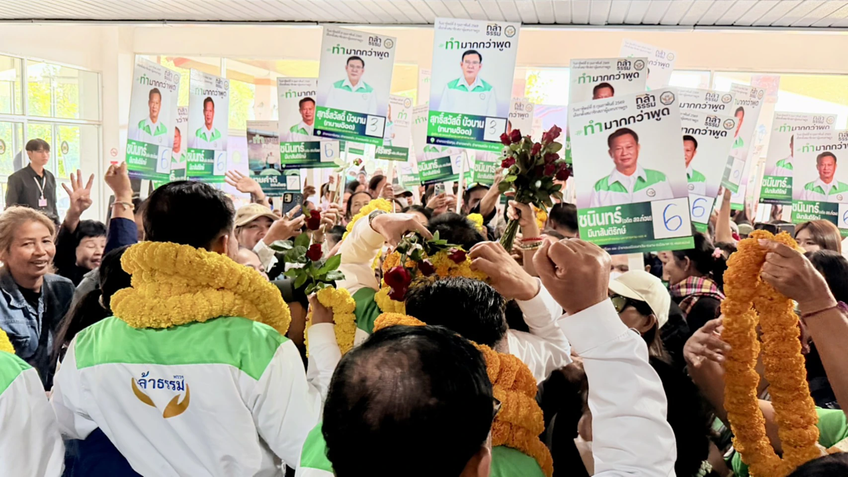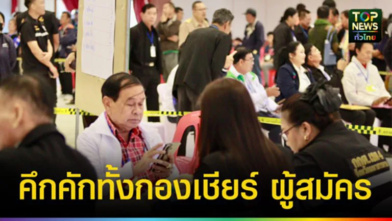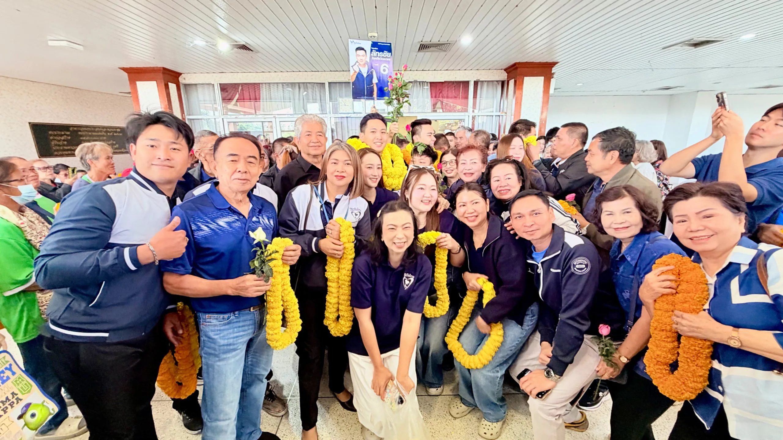 วันที่ 27 ธ.ค. 2568 ที่หอประชุมมหาวิทยาลัยราชภัฏมหาสารคาม บรรยากาศการรับสมัครสมาชิกสภาผู้แทนราษฎร (สส.) จังหวัดมหาสารคาม ทั้ง 6 เขต เป็นไปอย่างคึกคัก ตั้งแต่ช่วงเช้ามีผู้สมัครพร้อมกองเชียร์เดินทางมาร่วมให้กำลังใจกันอย่างต่อเนื่อง โดยกองเชียร์ของผู้สมัครแต่ละรายได้ส่งเสียงตะโกนและแสดงสัญลักษณ์เชียร์ผู้สมัครของตนเอง สร้างสีสันให้กับบรรยากาศโดยรอบสถานที่รับสมัคร