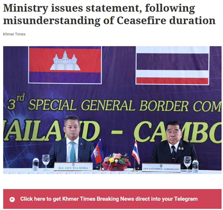 ขแมร์ไทม์สรายงานว่ากระทรวงสารสนเทศของกัมพูชาได้ออกแถลงการณ์ในวันนี้ (อาทิตย์ที่ 28 ธค.) หลังจากเกิดความเข้าใจผิดอย่างกว้างขวางว่า ข้อตกลงหยุดยิงระหว่างกัมพูชาและไทย ซึ่งลงนามไปเมื่อวานนี้และมีผลบังคับใช้ตั้งแต่เวลา 12.00 น. ของวันที่ 27 ธันวาคม 2568 นั้น มีผลบังคับใช้เพียง 72 ชั่วโมงหรือ 3 วันเท่านั้น