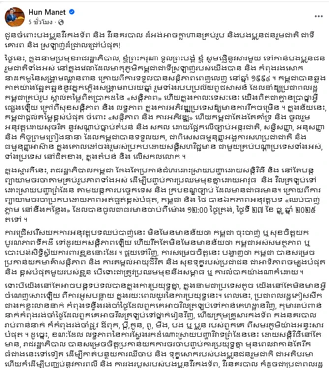 วันนี้(29 ธ.ค.) เมื่อเวลา 07.00 น.ที่ผ่านมา นายฮุน มาเนต นายกรัฐมนตรีกัมพูชา โพสต์ข้อความในเฟซบุ๊ก Hun Manet ว่า ขอเรียนถึงพี่น้องทหารกล้า และตำรวจผู้กล้าหาญทุกนาย ตลอดจนพี่น้องประชาชนร่วมชาติอันเป็นที่เคารพและรักยิ่งทุกท่าน