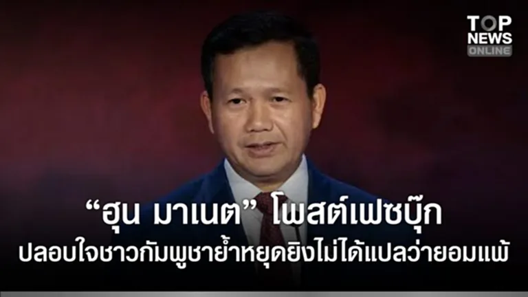 “ฮุน มาเนต” โพสต์เฟซบุ๊ก ปลอบใจชาวกัมพูชา ย้ำหยุดยิงไม่ได้แปลว่ายอมแพ้ แต่เพื่อลดการสูญเสีย ย้ำปักปันเขตแดนตามกลไก JBC ปัดให้ไทยยึดแล้วยึดเลย