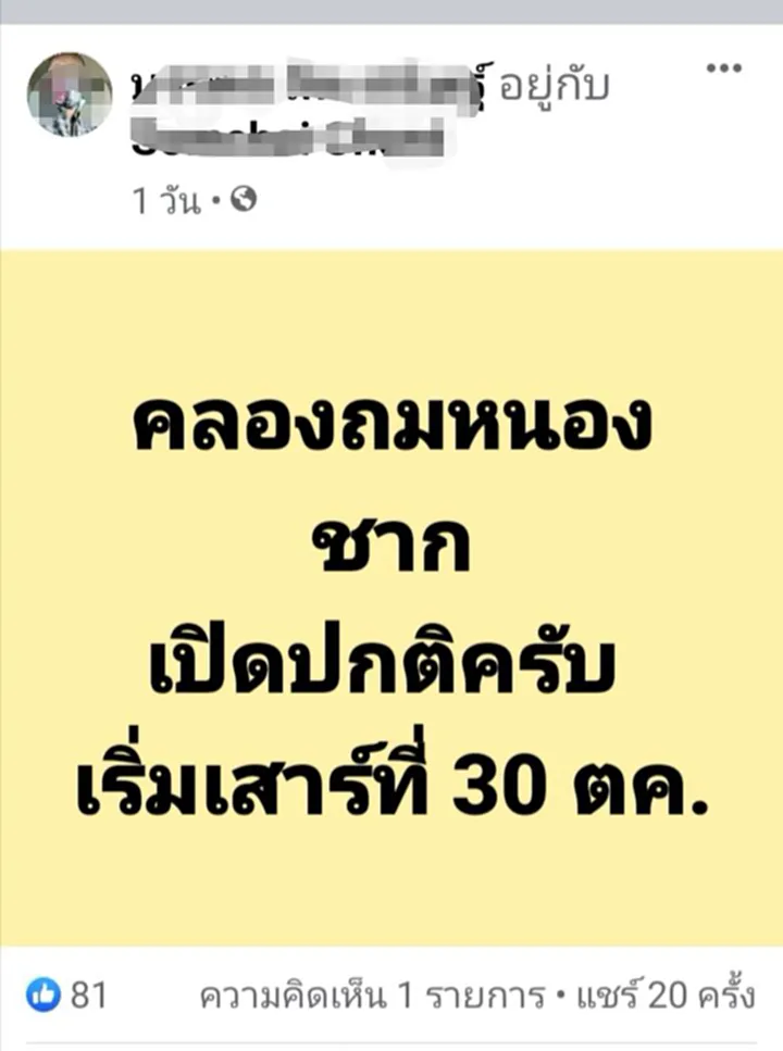 เมื่อเวลา 10.00​ น.วันที่​ 28 ตุลาคม​ 2564​ ผู้สื่อข่าวได้พบว่ามีการแชร์ข้อมูลการเปิด”ตลาดนัดคลองถม” หนองชากลงในเฟสบุ๊ก​ มีเนื้อหาโฆษณาว่า​ “คลองถมหนองชาก​ เปิดปกติครับ​ เริ่มเสาร์ที่​ 30​ ต.ค.”