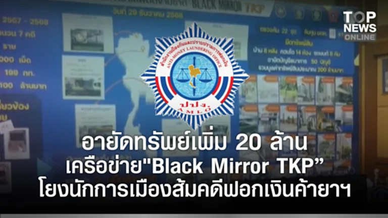 วันนี้ 30 ธันวาคม พ.ศ. 2568 สำนักงาน ปปง. ได้บูรณาการข้อมูลและพยานหลักฐานเกี่ยวกับการกระทำความผิดดังกล่าว กับ บช.ปส.2 และตรวจสอบเส้นทางการเงินของเครือข่าย Black Mirror TKP แล้วพบทรัพย์สิน ที่เกี่ยวกับการกระทำความผิดเพิ่มเติมของกลุ่มบุคคลตามหมายจับเป็นหลักทรัพย์และเงิน ในบัญชีเงินฝากธนาคาร จำนวน 26 รายการ เลขาธิการ ปปง. จึงมีคำสั่งให้อายัดหลักทรัพย์และเงินในบัญชีเงินฝากธนาคารดังกล่าว รวมมูลค่า 20 ล้านบาท เพื่อดำเนินการตามกฎหมายฟอกเงินต่อไป