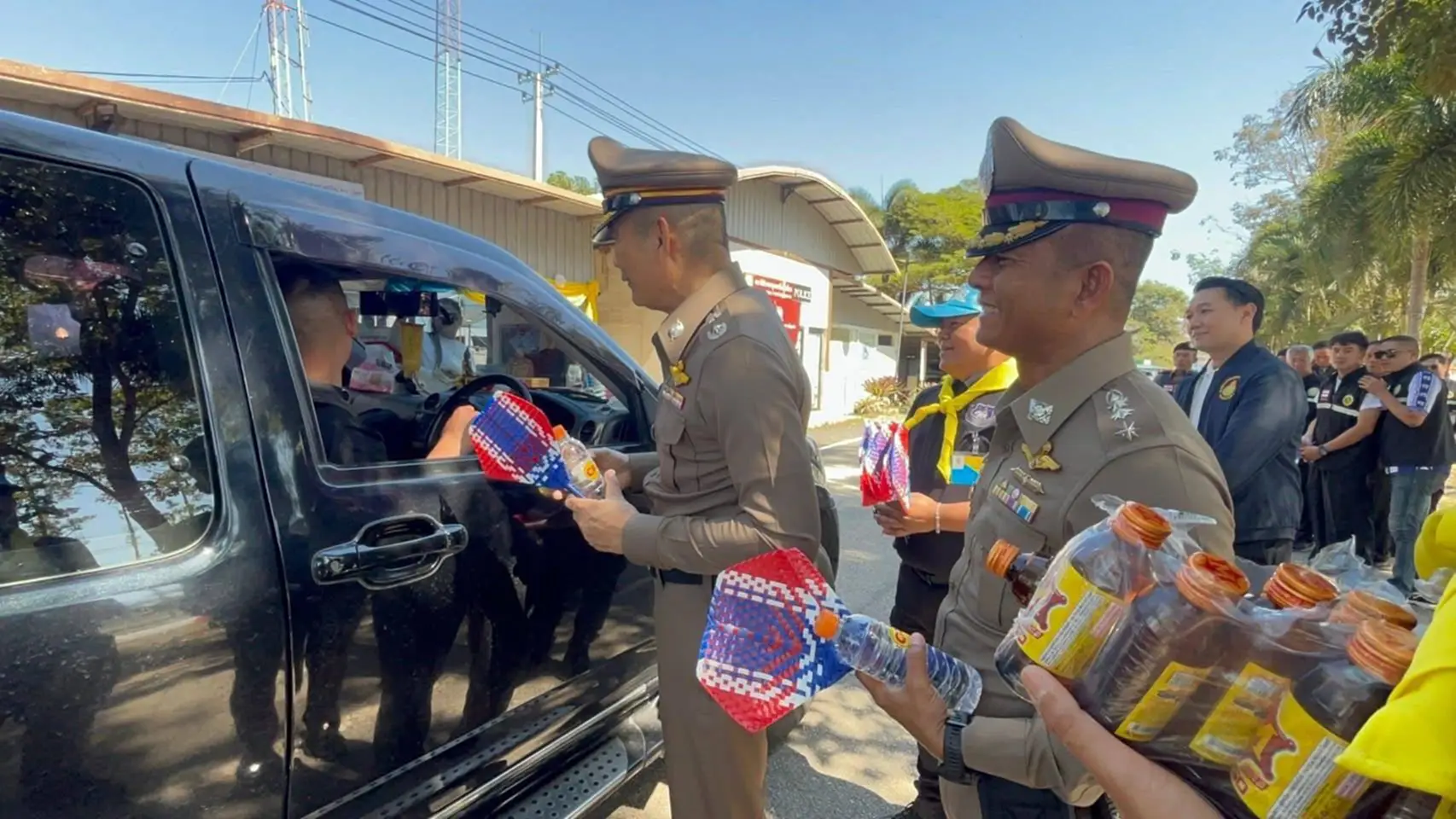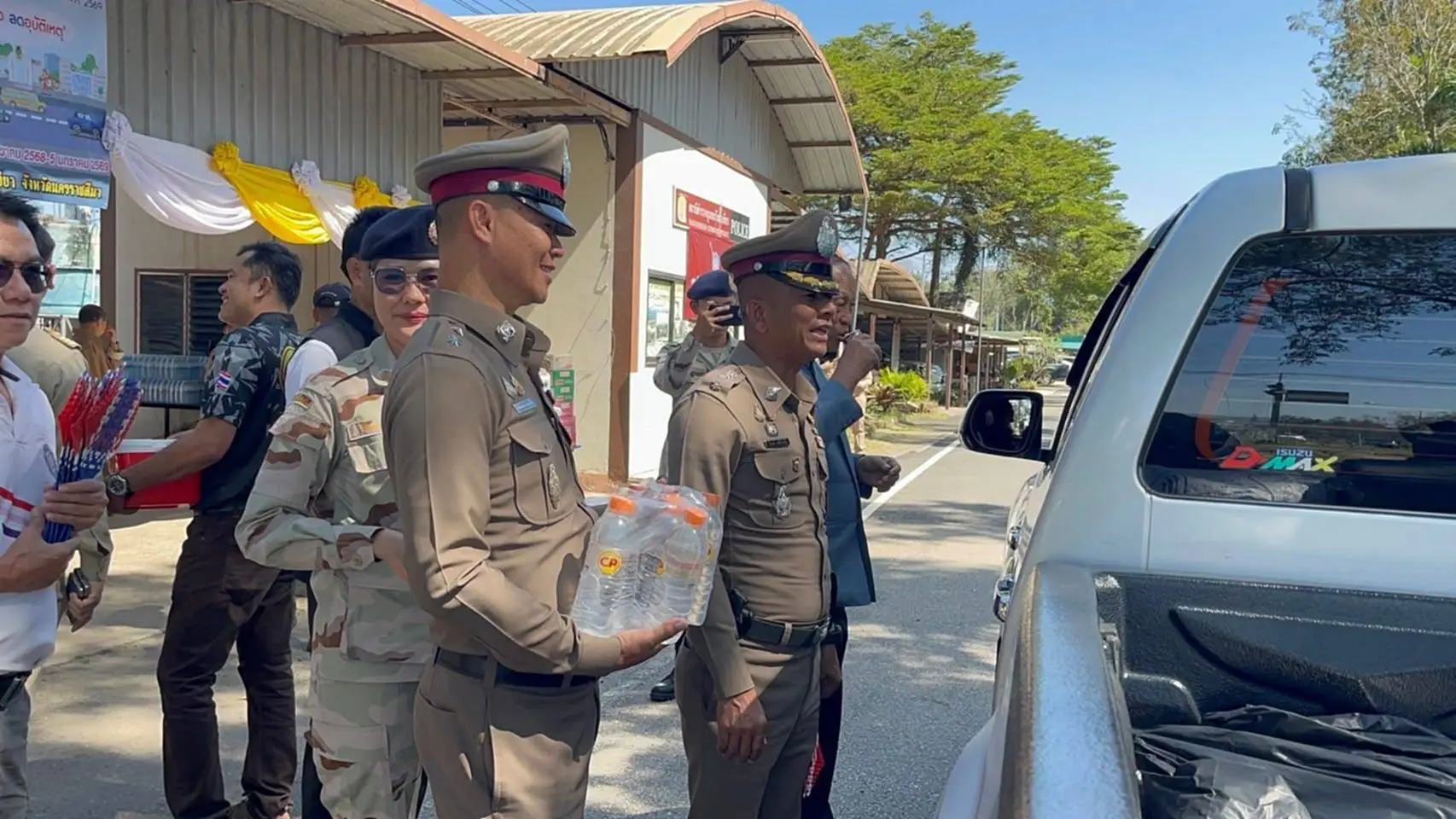 ในขณะที่ พล.ต.ต.ณรงค์ศักดิ์ พรหมทา ผบก.ภ.จว.นครราชสีมา เซอร์ไพรส์ด้วยการแจกพัดธงชาติไทย น้ำดื่ม ให้ประชาชนที่ขับรถ เดินทางกลับภูมิลำเนา ช่วงเทศกาลปีใหม่ พร้อมเชิญชวนคนไทยร่วมส่งกำลังใจให้ทหารชายแดน ปกป้องอธิปไตย