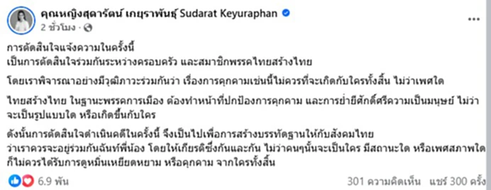 วันที่ 30 ธ.ค. 68 เมื่อเวลา 15.40 น. คุณหญิงสุดารัตน์ เกยุราพันธุ์ หัวหน้าพรรคไทยสร้างไทย ได้โพสต์เฟชบุ๊กอีกครั้งว่า การตัดสินใจแจ้งความในครั้งนี้ เป็นการตัดสินใจร่วมกันระหว่างครอบครัว และสมาชิกพรรคไทยสร้างไทย โดยเราพิจารณาอย่างมีวุฒิภาวะร่วมกันว่า เรื่องการคุกคามเช่นนี้ไม่ควรที่จะเกิดกับใครทั้งสิ้น ไม่ว่าเพศใด