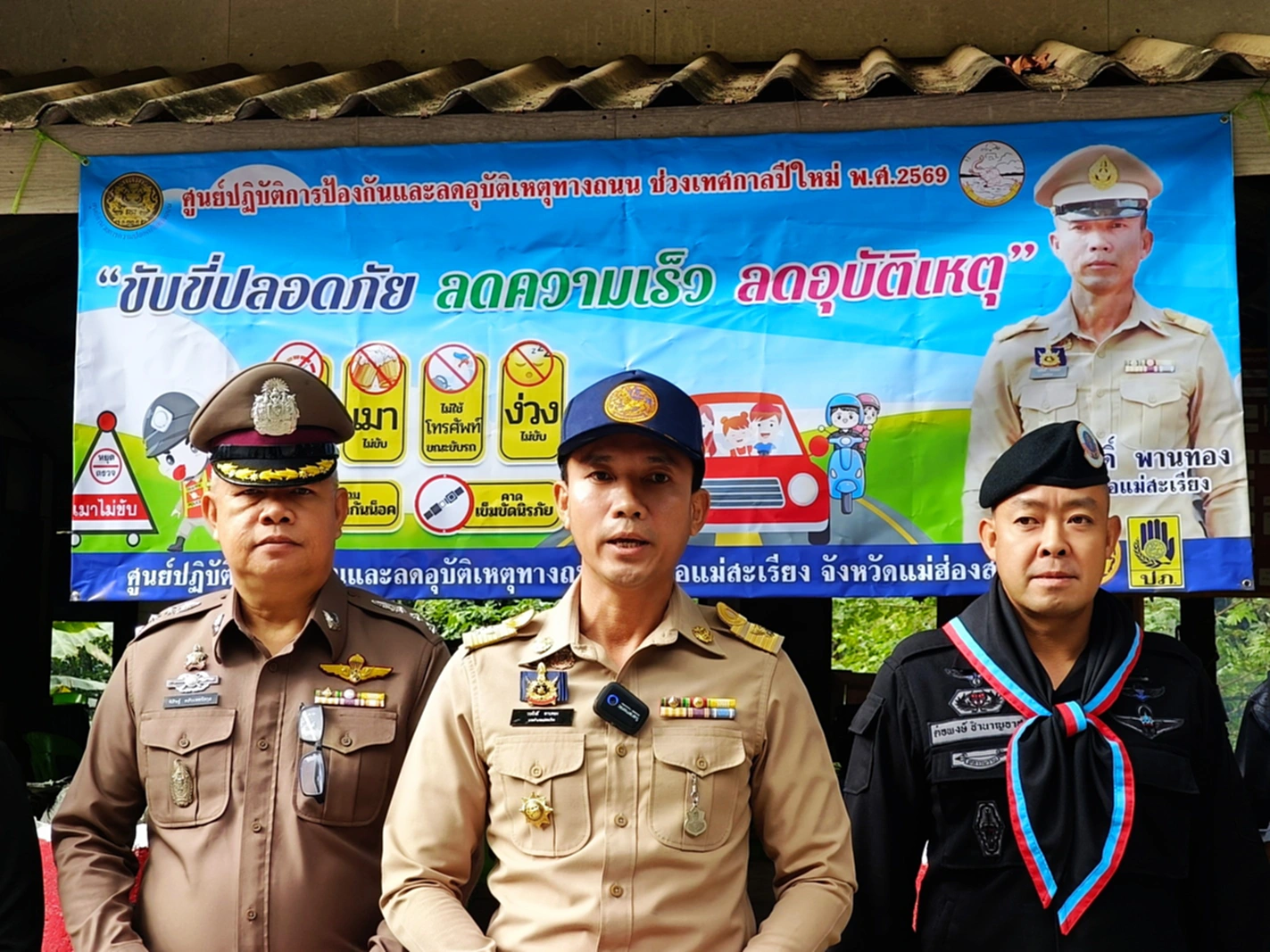 วันที่ 30 ธันวาคม 2568 ที่จุดตรวจหน้าถ้ำ หมู่ 8 ตำบลแม่สะเรียง อำเภอแม่สะเรียง จังหวัดแม่ฮ่องสอน นายวรศักดิ์ พานทอง นายอำเภอแม่สะเรียง / ผู้อำนวยการศูนย์ปฏิบัติการความปลอดภัยทางถนนอำเภอแม่สะเรียง เป็นประธานในพิธีเปิดศูนย์ปฏิบัติการป้องกันและลดอุบัติเหตุทางถนนช่วงเทศกาลปีใหม่ 2569 โดยมีส่วนราชการ องค์กรปกครองส่วนท้องถิ่น กำนัน ผู้ใหญ่บ้าน อาสาสมัครป้องกันภัยฝ่ายพลเรือน (อปพร.) และภาคีเครือข่ายเข้าร่วมพิธี