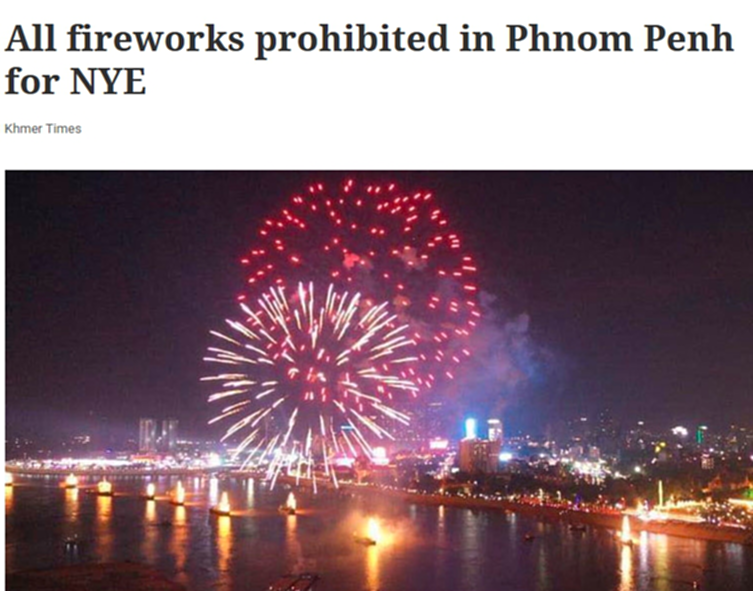 ขแมร์ไทม์สและแคมโบเดียเนส สื่อกัมพูชารายงานว่ารัฐบาลท้องถิ่นกรุงพนมเปญได้ออกแถลงการณ์ห้ามการจุดพลุและดอกไม้ไฟทุกประเภทในงานฉลองปีใหม่ที่กำลังจะมาถึง (2569) ที่กรุงพนมเปญ โดยให้เหตุผลด้านความปลอดภัย และความสงบเรียบร้อย พร้อมกันนี้ก็เตือนประชาชน ธุรกิจห้างร้าน ภาคเอกชน และนักท่องเที่ยวทั้งชาวกัมพูชาและชาวต่างประเทศให้ปฏิบัติตามคำสั่งดังกล่าวอย่างเคร่งครัด ผู้ที่ไม่ปฏิบัติตามจะถูกดำเนินคดีตามกฎหมาย